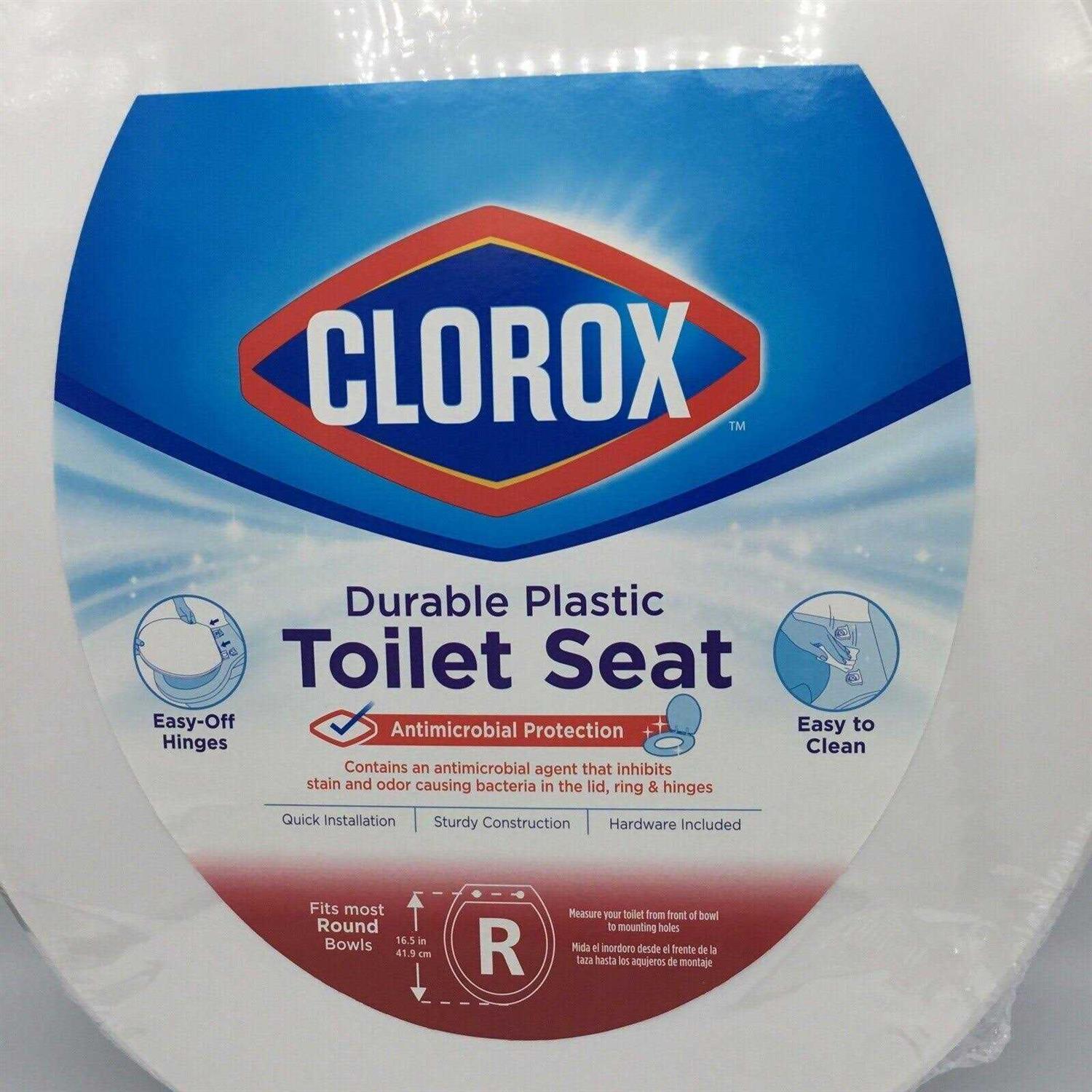 Antimicrobial properties are built in to inhibit the growth of stain and odor causing bacteria that may affect this product. This product does not protect users or others against bacteria, viruses, germs, or other disease organisms. Always clean and wash this product thoroughly before and after each use. For the highest standard in bathroom cleanliness, the Clorox Antimicrobial Round Plastic Toilet Seat is an essential, offering durability & quality performance in a timeless design. Each seat is specially treated with antimicrobial protection that inhibits stain & odor causing bacteria in the Lid, Toilet Seat Ring & Hinges. The antimicrobial material encapsulated in each toilet seat component provides continuous protection that resists washing away or wearing off over time for long-lasting durability. This added level of antimicrobial protection helps prolong the life of this design by warding off discoloration and loss of strength due to fungal attack. Featuring an easy to install design, all hardware is included so this seat is ready to use when you are! Sturdy, Easy-Off hinges offer a wiggle-free design when in use by securely attaching to your toilet and an easy to remove feature when it is time to clean! Simply flip up the mounting covers on the hinges and pull the toilet seat off to release and remove the seat. When you are finished cleaning, replace the seat and lock the mounting covers back into place. Thick, protective bumpers on the underside of each seat help prevent scratches and scrapes on the surface of porcelain toilet bowls. Cleaning is a breeze! Simply wipe down with a soft, damp cloth using mild detergent, avoiding abrasive cleaners where necessary.