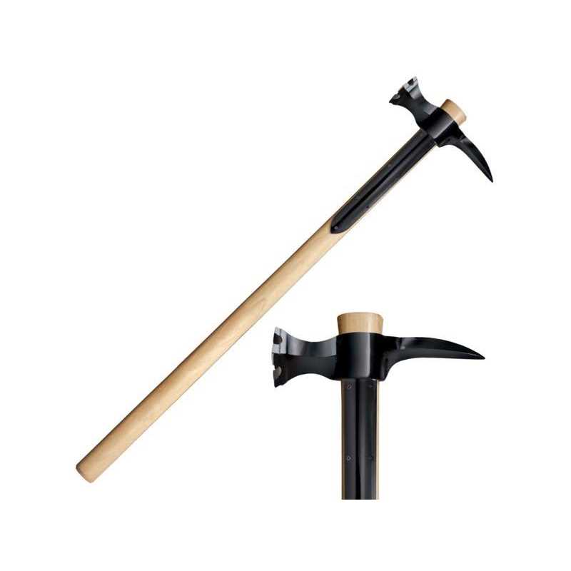 Cold Steel War HammerA fully armed 13th century knight was a true power, capable of plowing through opponents while encased in his plate armor that could shed, deflect or absorb the blows of his foes. Enter the War Hammer an ideal weapon for use against an opponent who is encased in plate steel. The heavy hammer head could crush the strongest helmet or suit of plate armor with just a few blows and the back spike could rip through helm and plate like a modern can opener! Now Cold Steel brings you an inexpensive, yet highly effective, recreation of this awesome weapon. Weighing a little over 2-1/2 pounds, it is highly maneuverable and can be wielded with one or both hands. The head is drop forged out of 1055 steel and differentially heat treated. The handle of the War Hammer has been designed to be equally tough. Made of straight grain American Hickory and measuring 30 inches long, it provides tremendous leverage. To protect the handle from assault it has an included pair of sturdy steel langets.