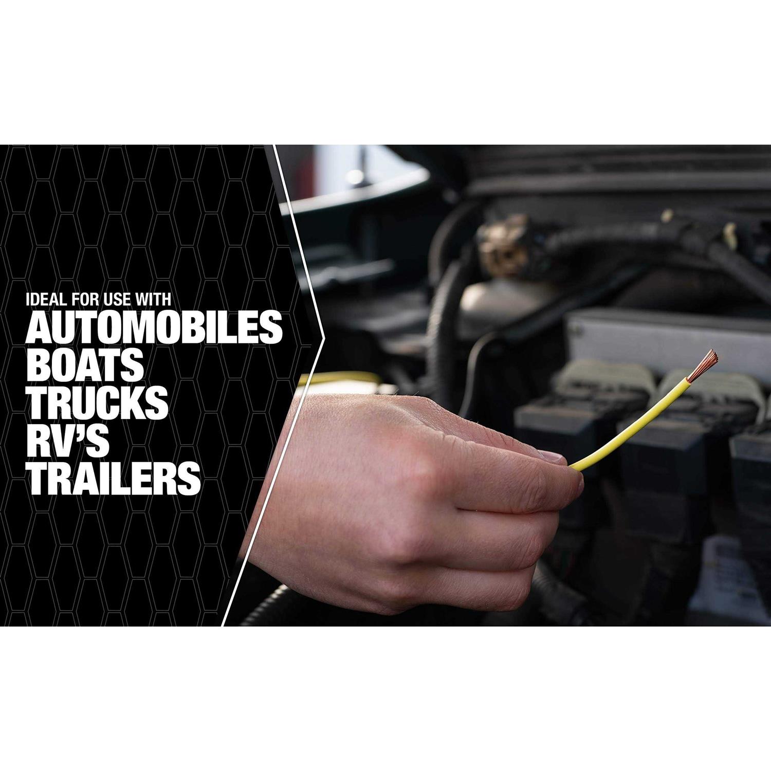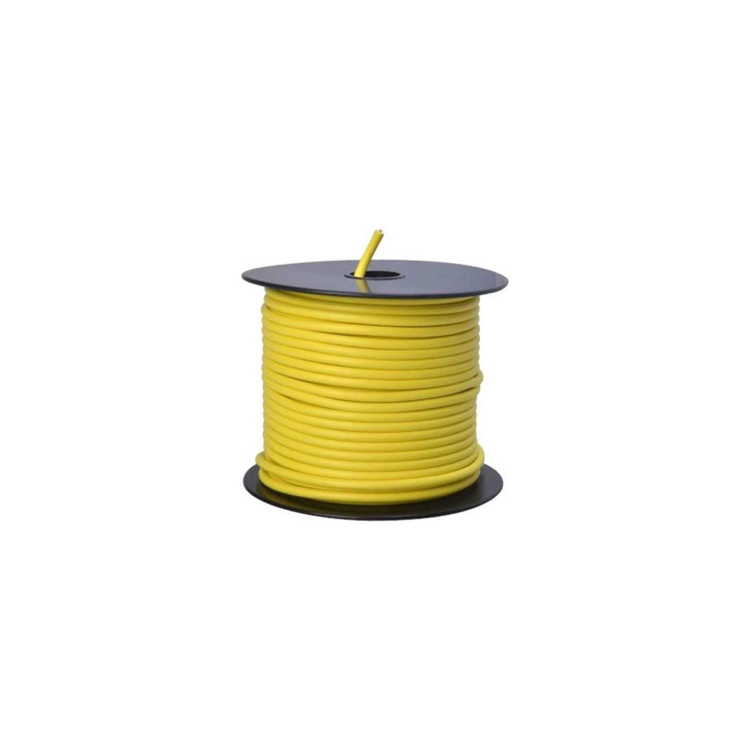 Durable PVC outer-jacket resists water, oil, and chemicals. Full gauge stranded copper for higher current-carrying capacity. Use for light switch to fuel block or relay. Vehicle electrical systems at nominal voltage of 60 DC volts (25 AC volts) or less. SAE standards, Ro HS compliant. Size: 100′ Color: Yellow 12 gauge Durable PVC outer-jacket resists water, oil, and chemicals Full gauge stranded copper for higher current-carrying capacity Use for light switch to fuel block or relay Vehicle electrical systems at nominal voltage of 60 DC volts (25 AC volts) or less SAE standards, Ro HS compliant Packaged on a spool.