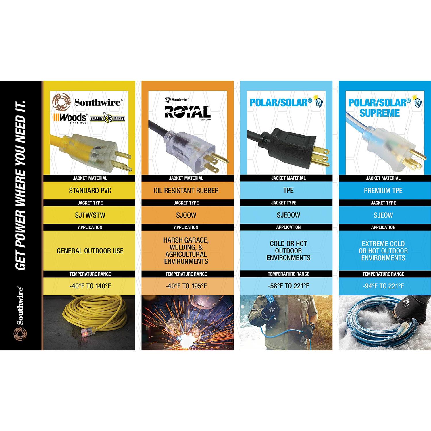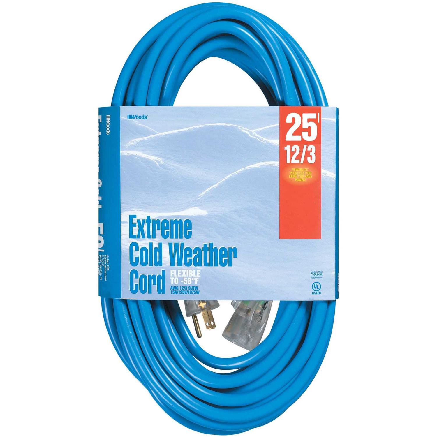 Withstands harsh, winter temperatures. Rated for -58 Deg (degrees) F (Fahrenheit) to 140 Deg F. All-copper wire construction. Ideal for use with heavy-duty equipment and tools. Features a highly visible bright blue jacket which provides extra safety as well as prevents loss and theft on jobsites. Extra durable, oversized, clear molded plug prevents accidental bending or breaking. UL (Underwriter’s Laboratories) listed.