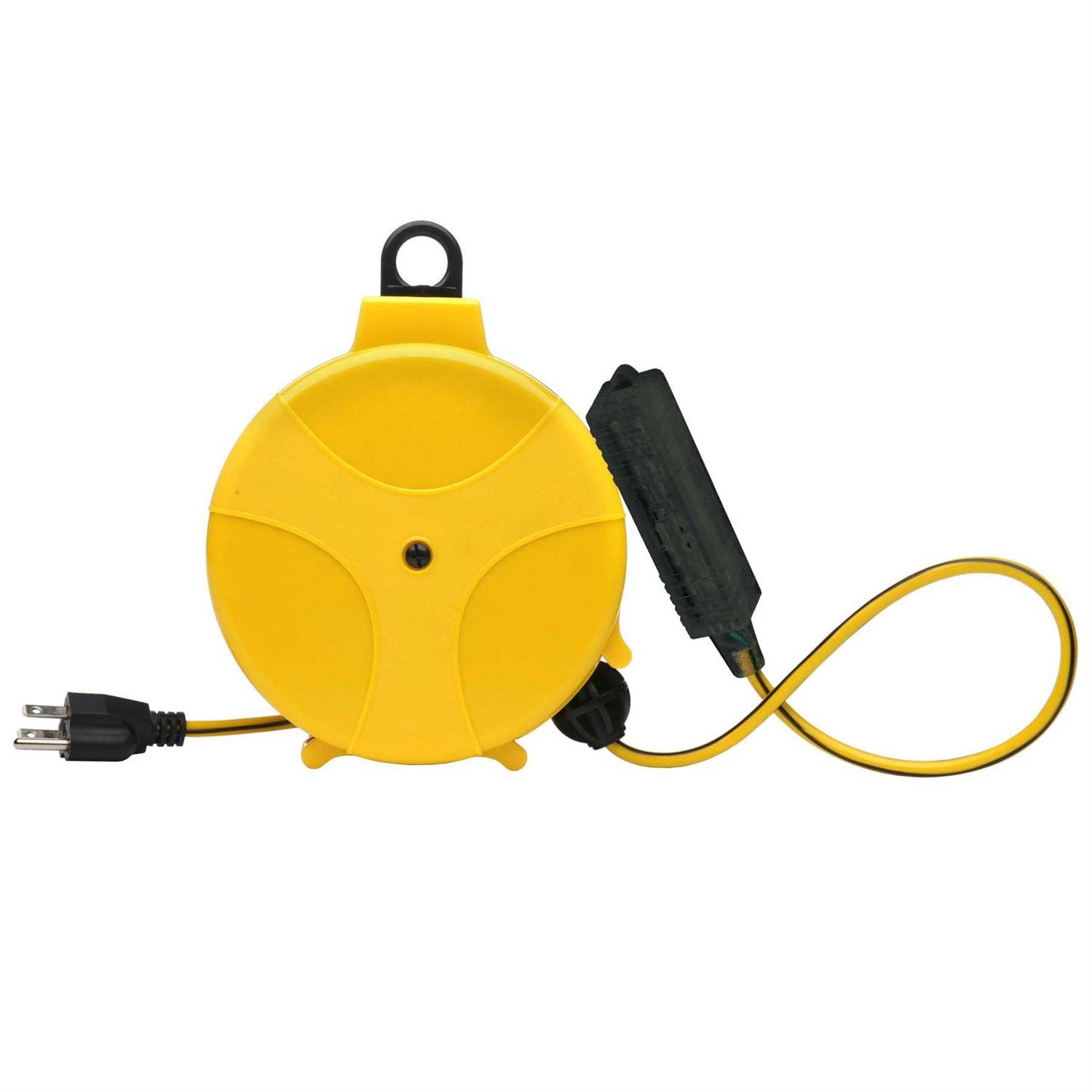 The Designers Edge 16/3-Gauge 20′ Retractable Cord Reel offers 20 feet of portable power and keeps your workstation organized. Made of plastic, this reel features three grounded outlets, a light-up power display and a yellow finish. The 16-gauge, 20-foot cord is yellow and black with a safety stripe for improved visibility. The black loop (on the Designers Edge 16/3-Gauge 20′ Retractable Cord Reel) adds versatility and the lighted triple tap shows when power is on. This product is CETL listed, meaning it has been tested for safety and quality by an independent agency. Since 1987, Designers Edge has been building its reputation as an innovator of commercial and industrial lighting. Designers Edge is recognized as a leader in its industry and holds multiple patents and awards for its world class designs.