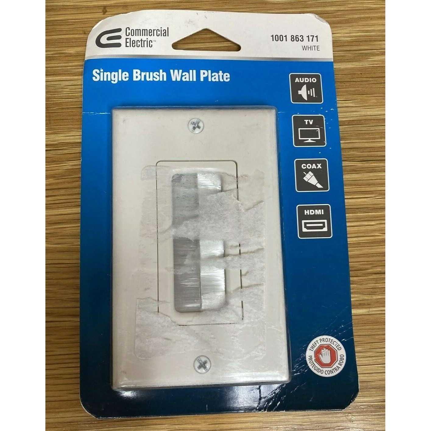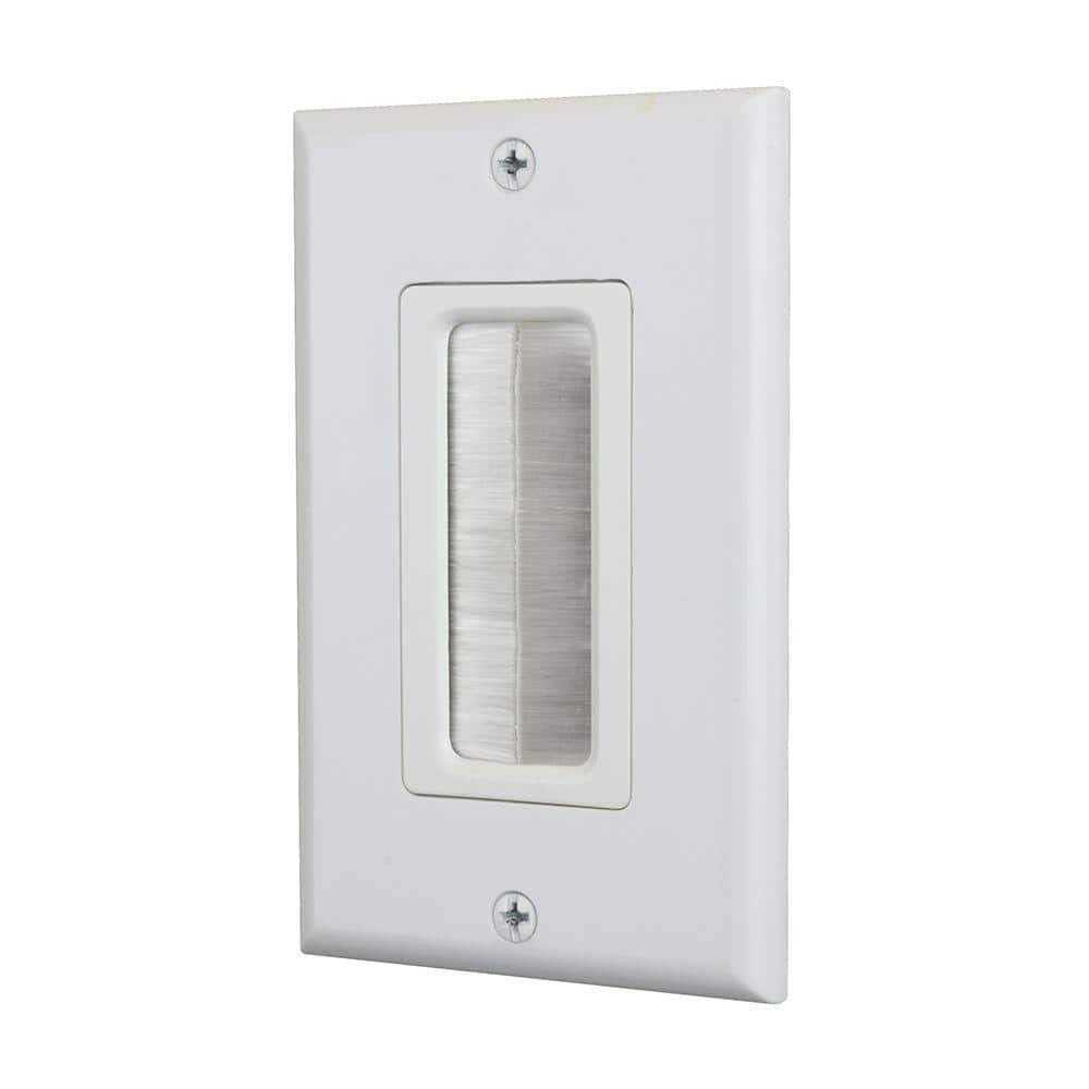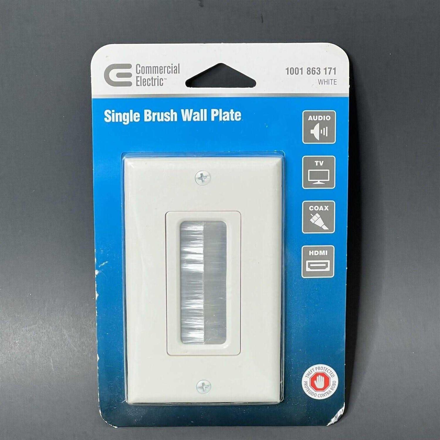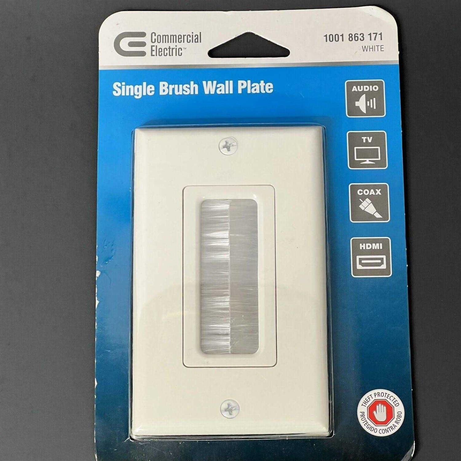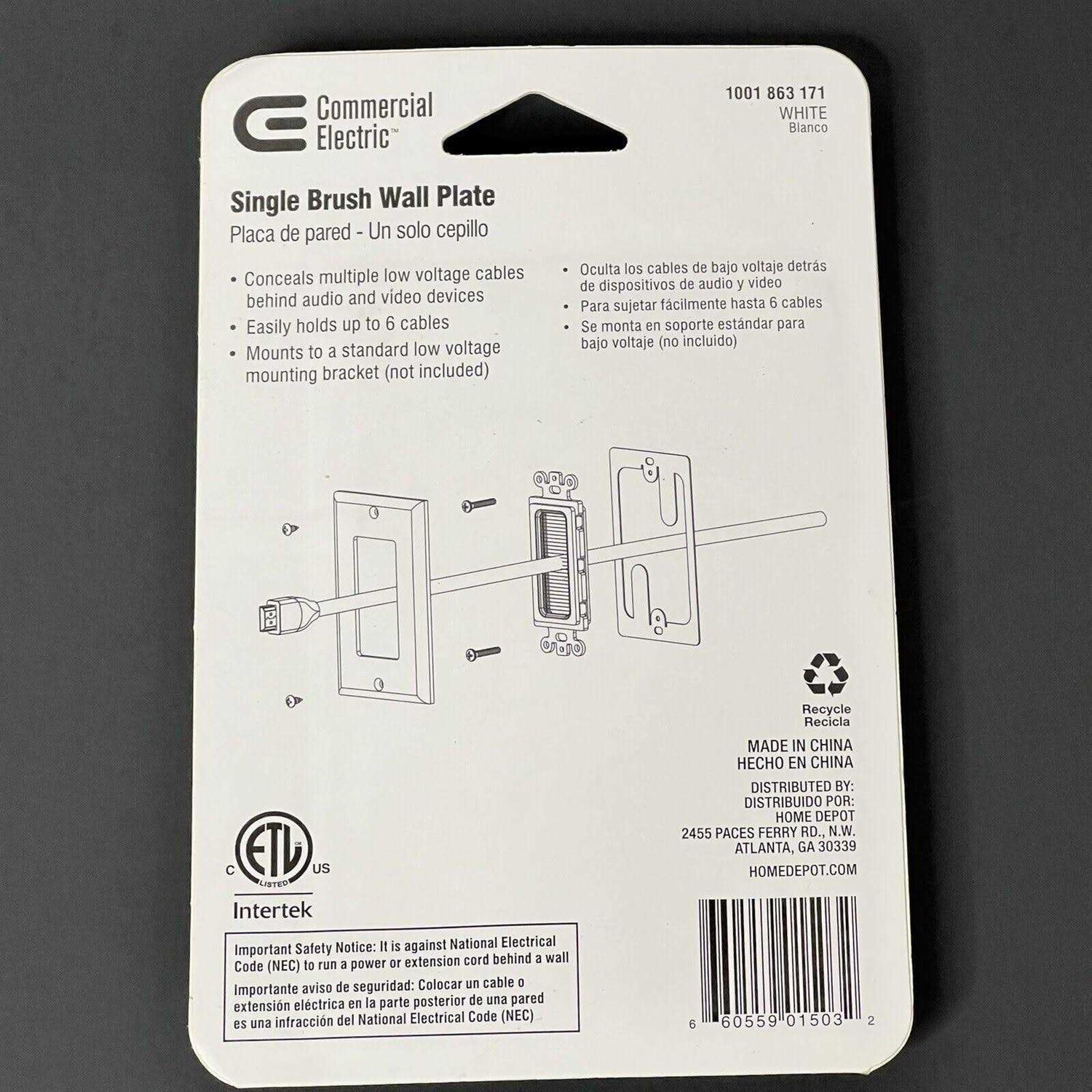 Commercial Electric’s patented Single Brush Wall Plate is used to install low voltage cables behind your HDTV, amplifier or other audio video devices. The Single Brush Plate is designed to be installed into a low voltage mounting bracket (sold separately) that is installed into the wall. Decor style cover plate is included. Color: White.