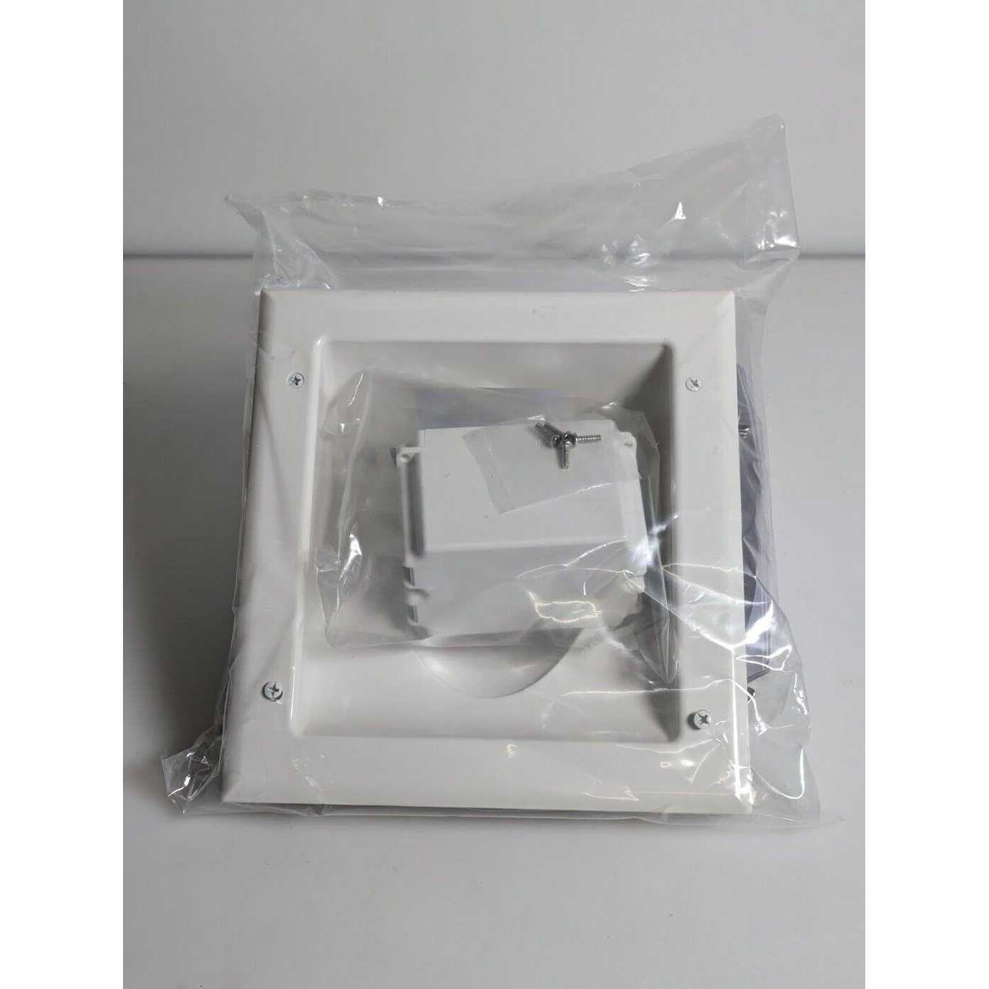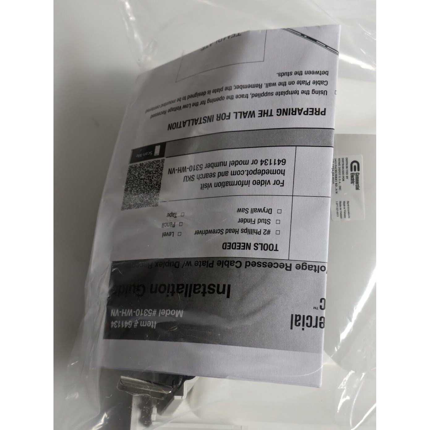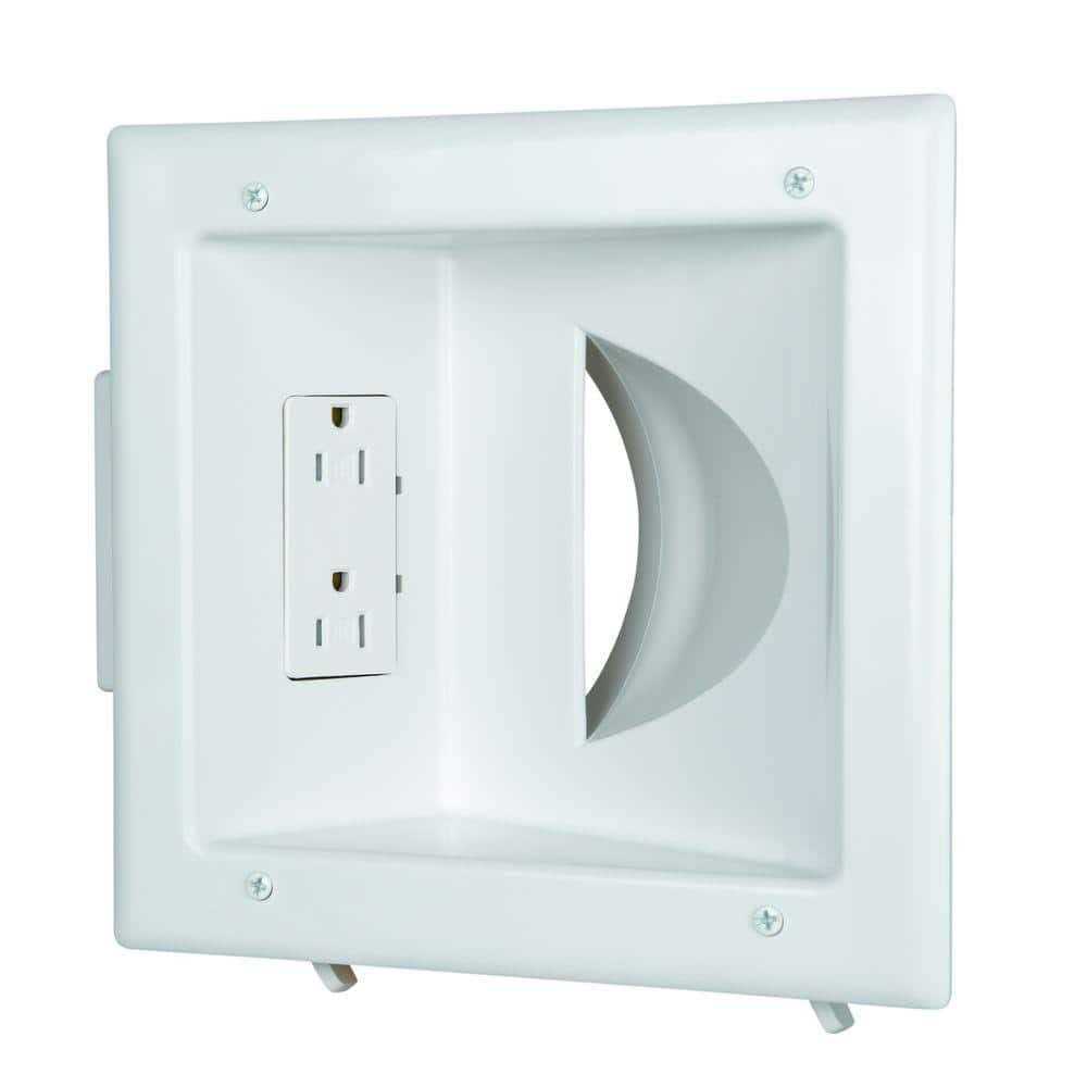 The Commercial Electric 15 Amp Recessed Media Plate with Duplex Receptacle is great for flat-screen TVs. Use it to both control unsightly cords and provide electricity. It has integrated mounting wings. Color: White.