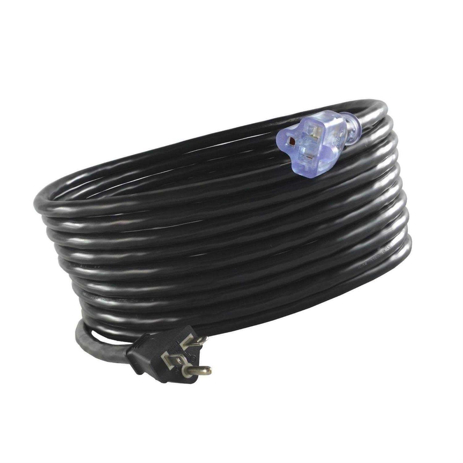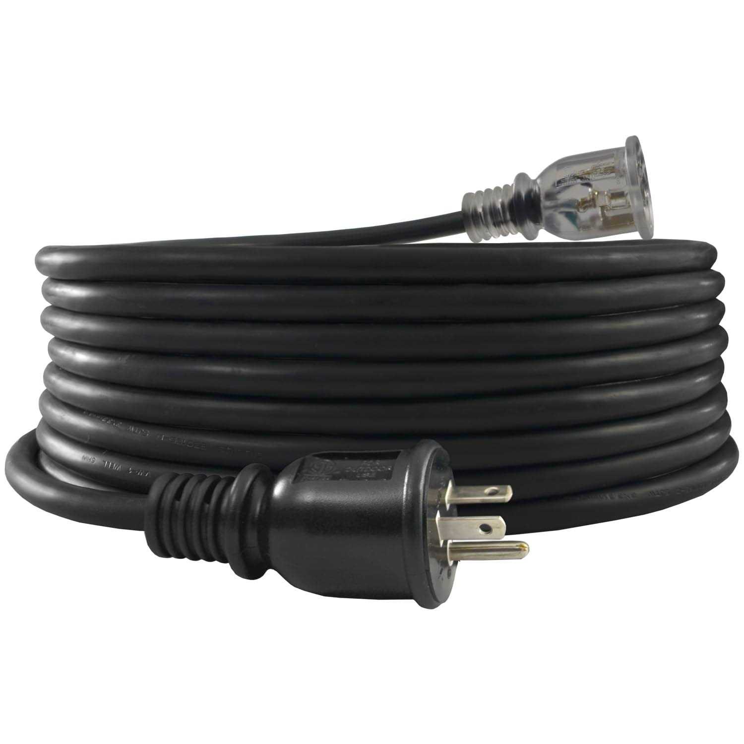 This 20 Amp outdoor extension cord features a neon power indicator light on the T-Blade 5-15/20 female connector for easily testing for power. It can link a transfer switch to a small generator that has a 5-20 outlet or power other devices that need this plug. At 50 ft., this length provides plenty of room away from the outlet. Color: Black.