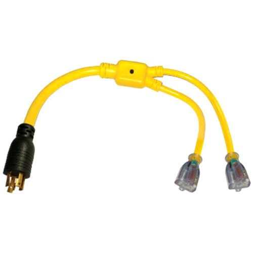 Cords, Plugs & Adapters by Conntek. Details:This generator Y adapter splits the 30A connection into two 15/20A outlets. Both female connectors are clear blue and glow a bright orange color when the adapter is receiving power.