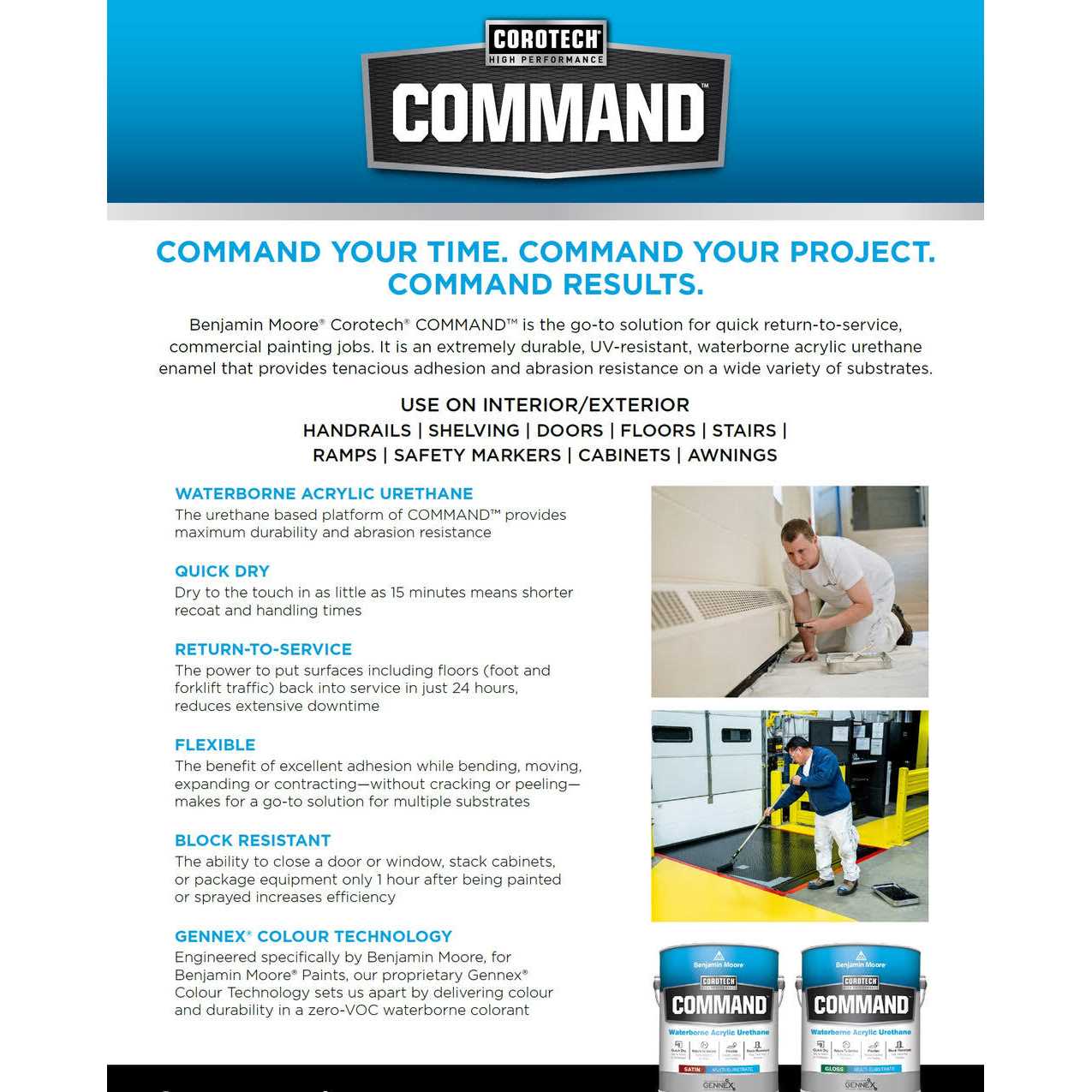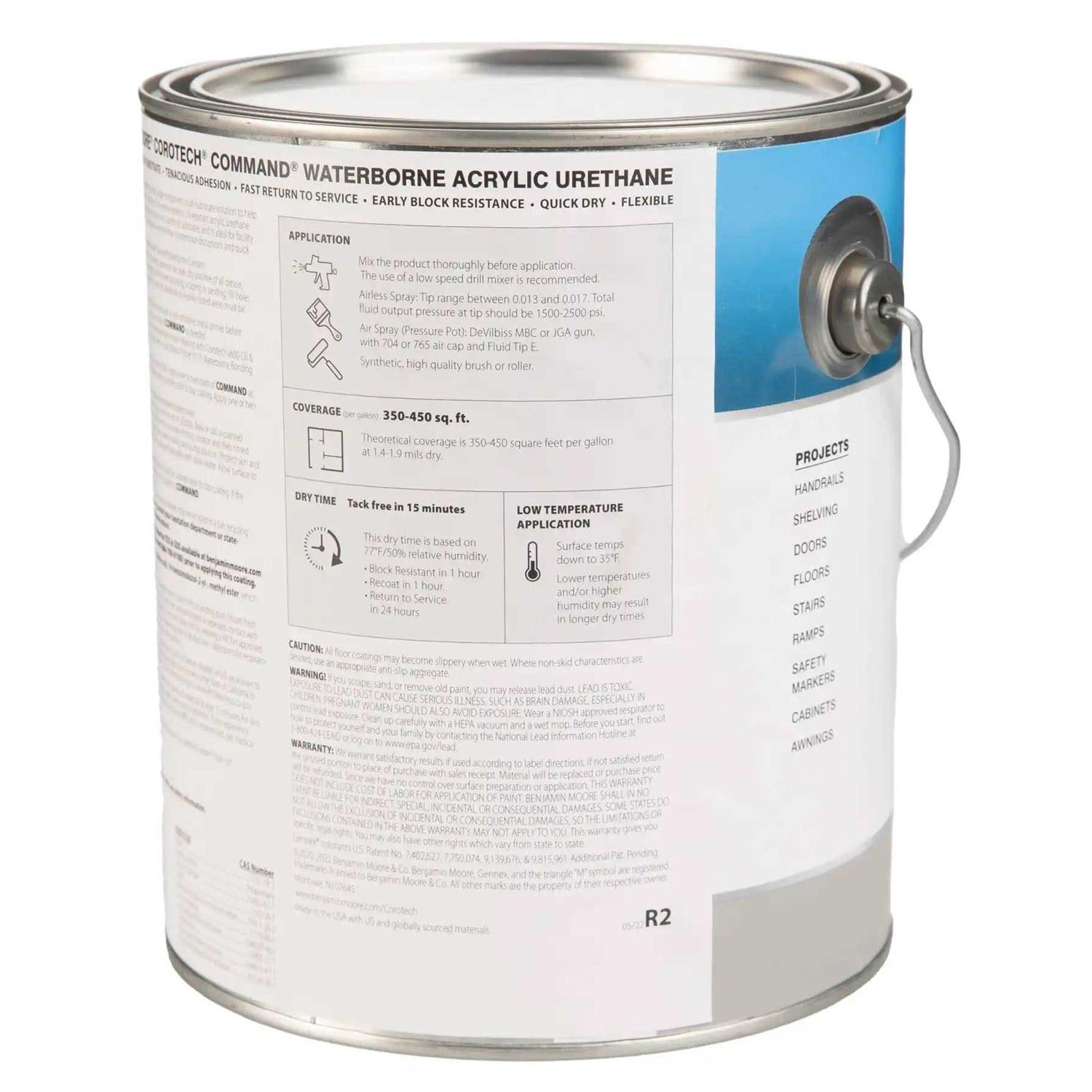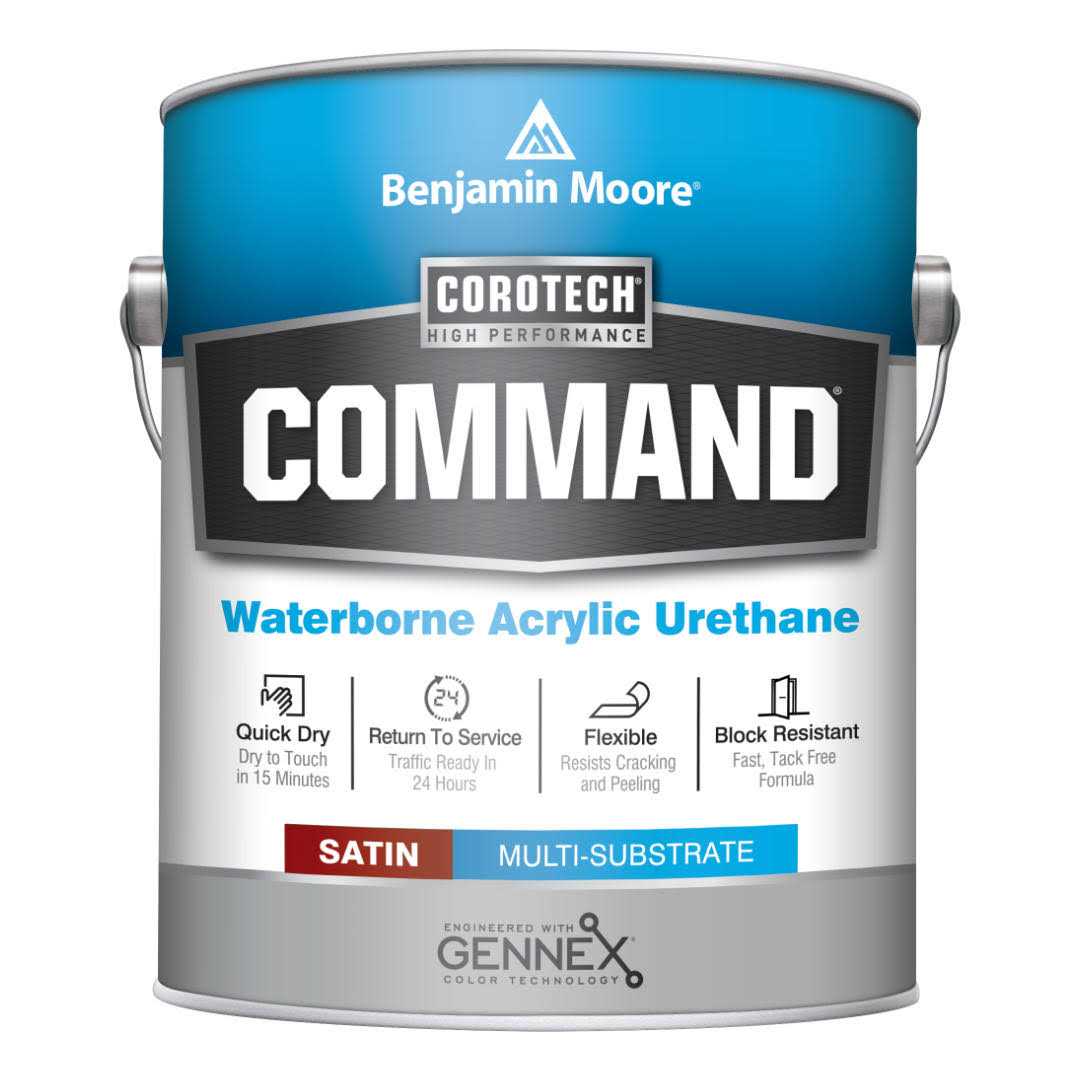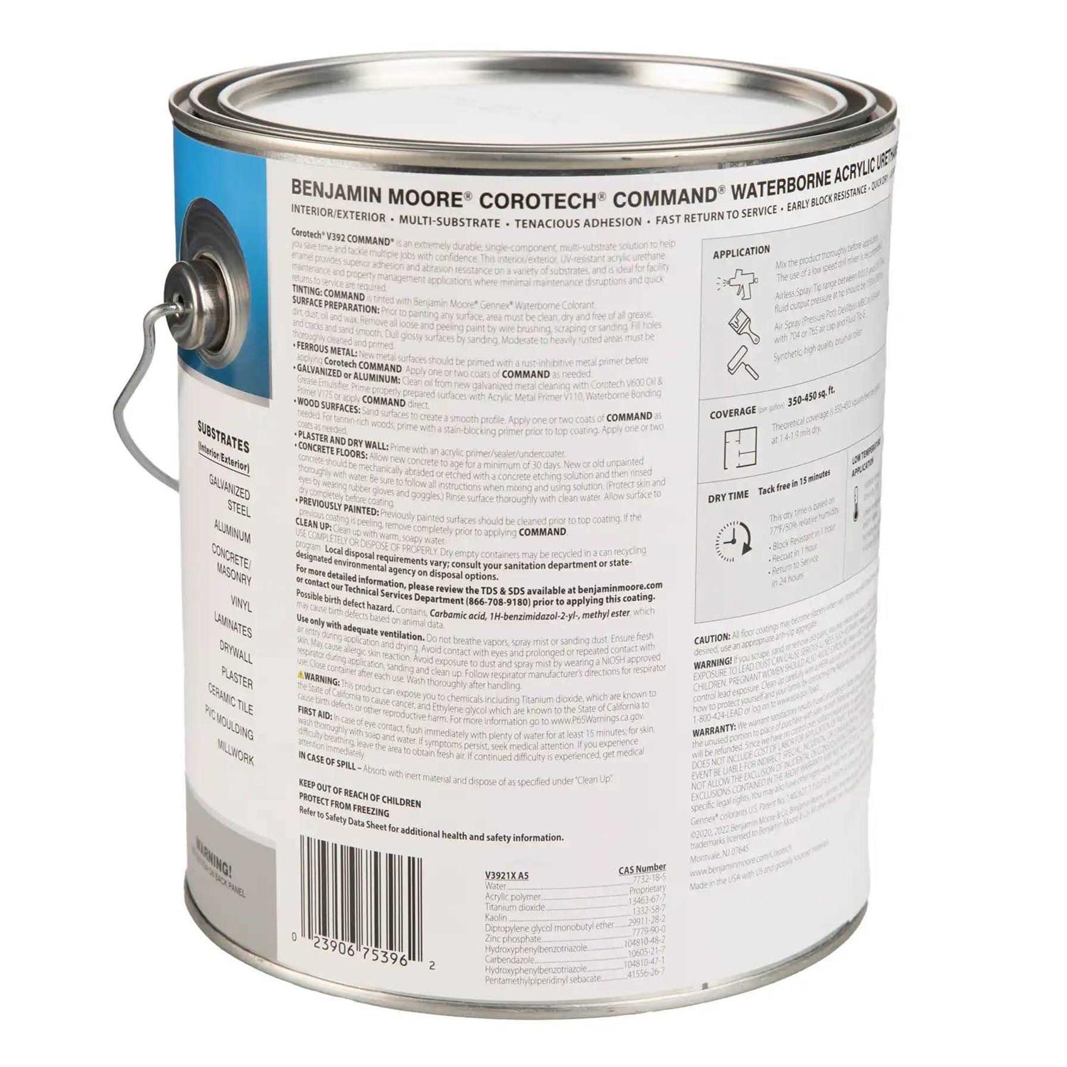 Benjamin Moore COMMAND is an extremely durable, single-component, multi-substrate solution to help you save time and tackle multiple jobs with confidence. This interior/exterior, UV-resistant acrylic urethane enamel provides superior adhesion and abrasion resistance on a variety of substrates, and is ideal for facility maintenance and property management applications where minimal maintenance disruptions and quick returns to service are required. This product is available in custom colors as well as factory made White (01), Bronzetone (62) and Black (80). For a custom color type in the color name, or number before adding the product to your cart. This version of Command, CV392, is VOC compliant in all areas. Command V392 and CV392 are different products and colors may appear different.