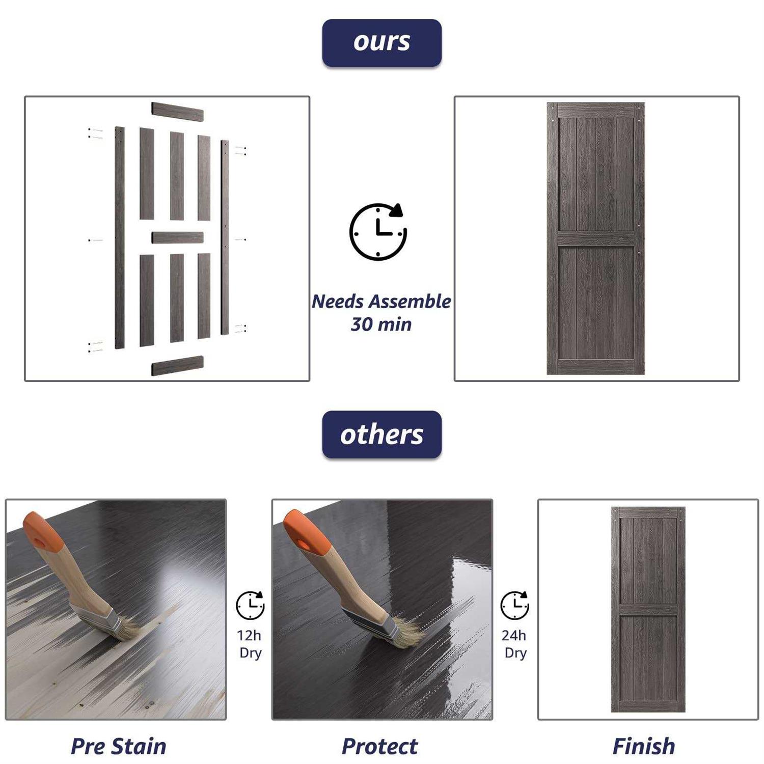 [NO NEED FOR A CRAFTMAN]: THE PACKAGE INCLUDE BARN DOOR SLATS, SLIDING HARDWARE KIT, Handle, Floor Guide, and Installation Tools, Detailed Instruction. THE DOOR IS NEED TO ASSEMBLE) [USING A BARN DOOR KIT IN 1H]: Usually, when you make or buy a traditional solid wood barn door kit, you need to paint the door to improve the beauty and durability. This virtually increases the cost of time /money. But if you choose our PVC covered one, you can use a finished barn door kit within 1 hour. [WATER-PROOF & SCRATCH-RESISTANT]: Prefinished PVC water-proof door surface is considered for durability, longevity, and ease of cleaning. High-quality PVC materials can also strengthen the protection of the door surface, especially for families with pets. [PERFECT WHITE SURFACE]: When painting white on the traditional solid wood barn door, it will appear uneven in color and lack of beauty. Finally, a white PVC barn door with a beautiful glossy surface will appear. [DIMENSION]: Width: 30″, Height: 84″, Thickness: 1 3/8″. The bottom of the door has a pre-made groove for the floor guide and pre-drilled holes for hangers and handle.