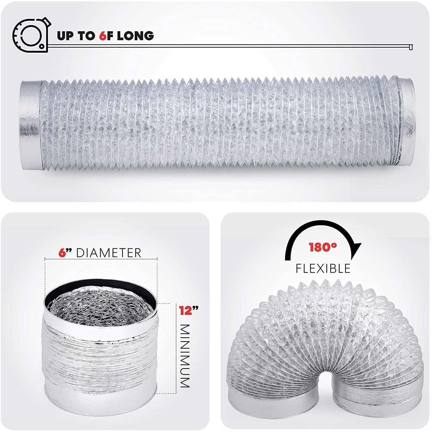 Material: This ventilation duct is made from High-quality aluminum that is temperature resistant, corrosion Resistant and long lasting. Durability: Triple-layer thickness reinforces long lasting performance and up to 180 degrees F operating temperature. Wide applications: This duct can be used in kitchens, bathrooms, greenhouses and grow rooms, HVAC systems and other applications etc. Easy installation: Duct is quick and easy to set up and is used for kitchen range hood exhausting. Clamps not included. Flexible design: 6 inch (diameter) and up to 6 feet (length) allows for duct to conveniently expand to fit your exhausting needs.