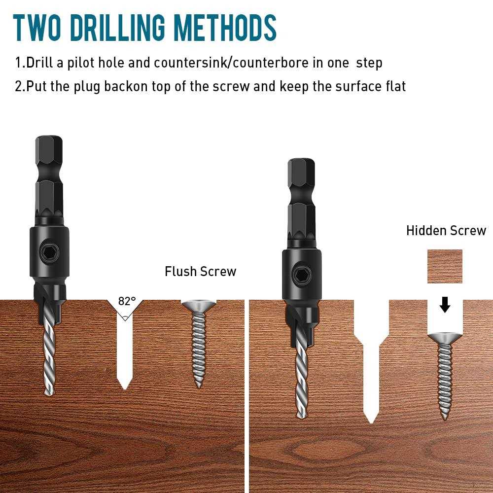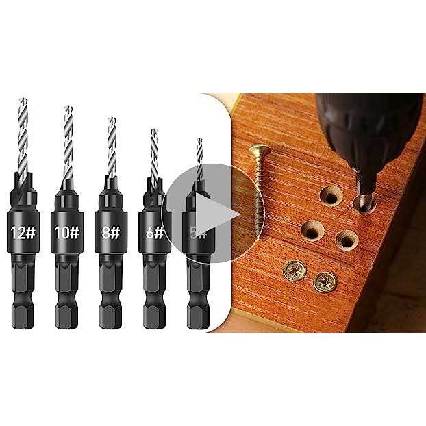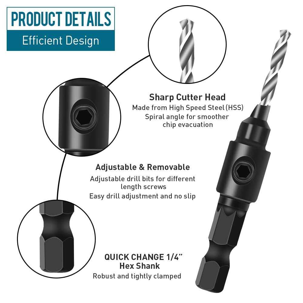 Features: nn–Material- Made of premium High Speed Steel with excellent hardness of HRC 62-64, it provides superior cutting power, high durability, and good abrasion resistance. Perfect sized hole for 5, 6, 8, 10, or 12 screws.n–Standard 82 Angle- These countersinks bits pilot screw are designed to match the most commonly used woodworking 82 screws you might encounter.n–1/4 hex Shank- Quick change chuck work with impact drills, and other power tools. Meet all your daily needs and the product interface size is suitable for most household Drills. Easy and simple woodworking use kit.n–Multi-Purpose- Suitable for home or professional woodworking project, used on wood, plastic, PVC, fiberboard, particleboard, plywood, rubber and more. Drill, countersink and counter bore in one step. This set comes with 5pcs replacement drill bits.n–Quality Guarantee- All the countersink bits are packaged in a plastic case, easy to organize and store. If youre not 100% satisfied with your pu [82° Standard Angle]- These milling bits for pilot end screws are designed to match the most commonly used 82° woodworking screws on the market. Jeu de Forets à Chanfreiner.