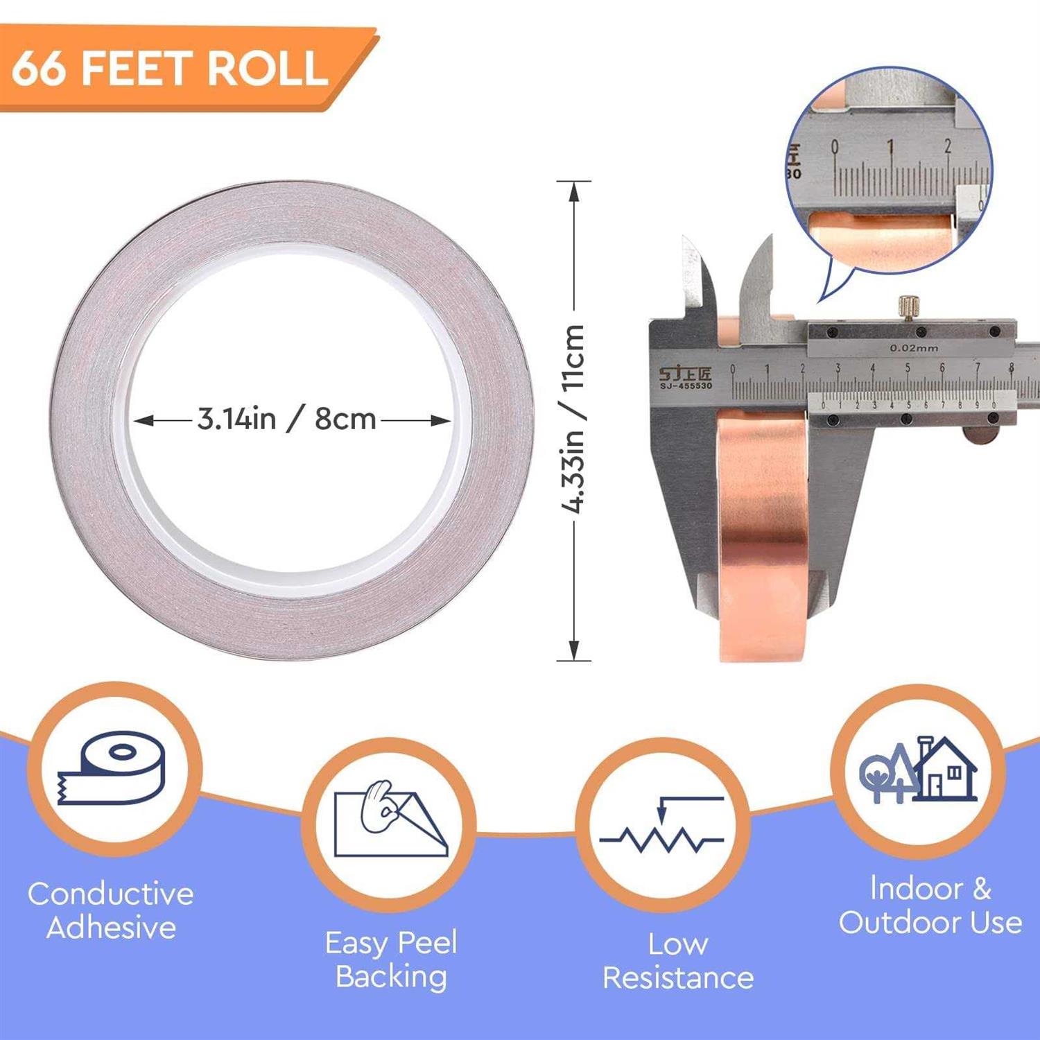 ADHESION CONDUCTIVE TAPE: Our 66ft copper tape conductive adhesive conducts current on both sides with very limited resistance. Because of high conduction, use our copper tape for soldering purposes, guitars, electrical connections ️ COPPER FOIL FOR STAINED GLASS: This 1 inch wide gives a strong backing thus making it a best tool for your broken glass. You can use this 1inch x 66FT stained glass copper foil for your home glass, wall, picture frames, mirror decoration COPPER TAPE FOR SLUGS AND SNAILS: Our 99.99% pure copper made which makes it a perfect tape for your slugs and snails. You can use our copper tape with full confidence for your plants and make your pots looks more beautiful then before BEST EMI/EMF/RFI WIRE SHIELDING: You can protect your electronic items from electromagnetic interference with our highly conductive copper strips of tape. Our Copper tape is one of the best product. FEEL FREE TO MESSAGE US IF YOU DIDN’T GET SATISFIED 24/7 Conductive Copper Tape 100% Pure Double Sided Adhesive Copper Foil Tape for Stained Glass