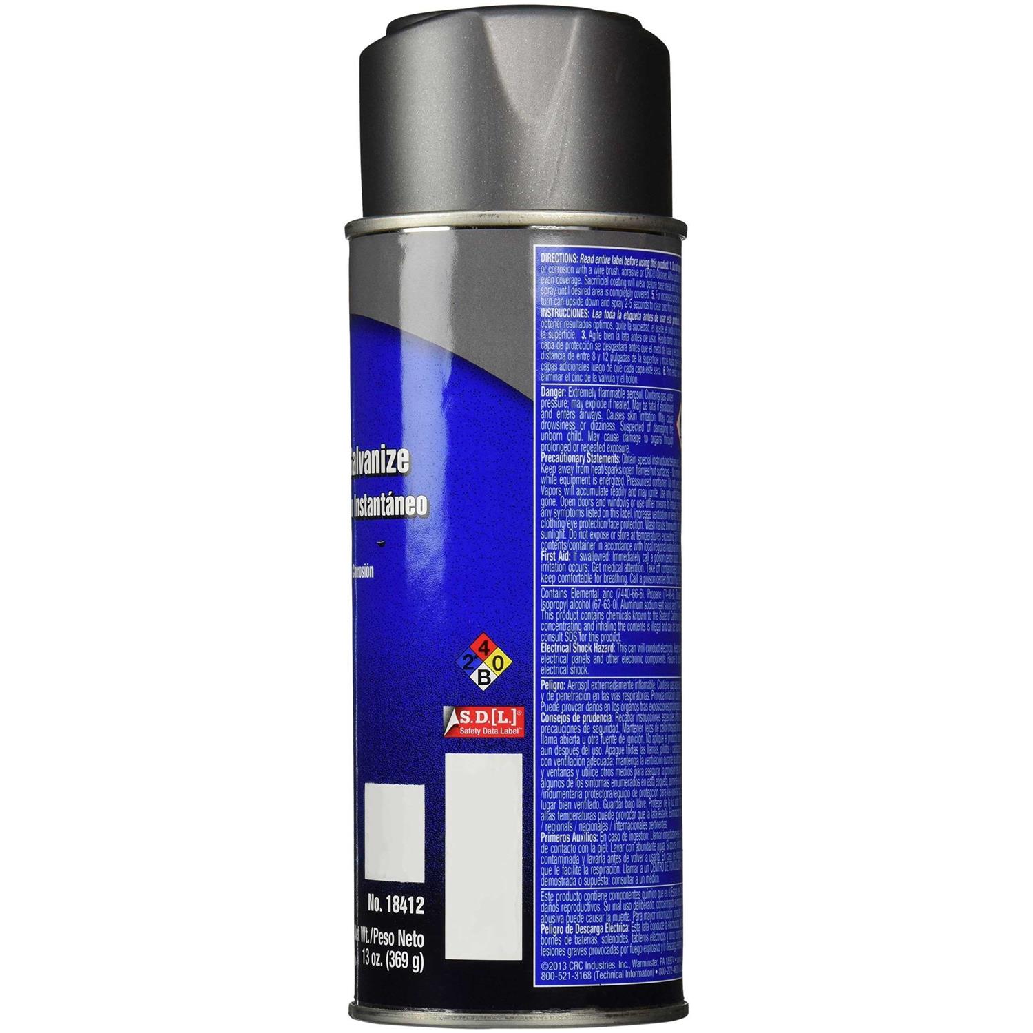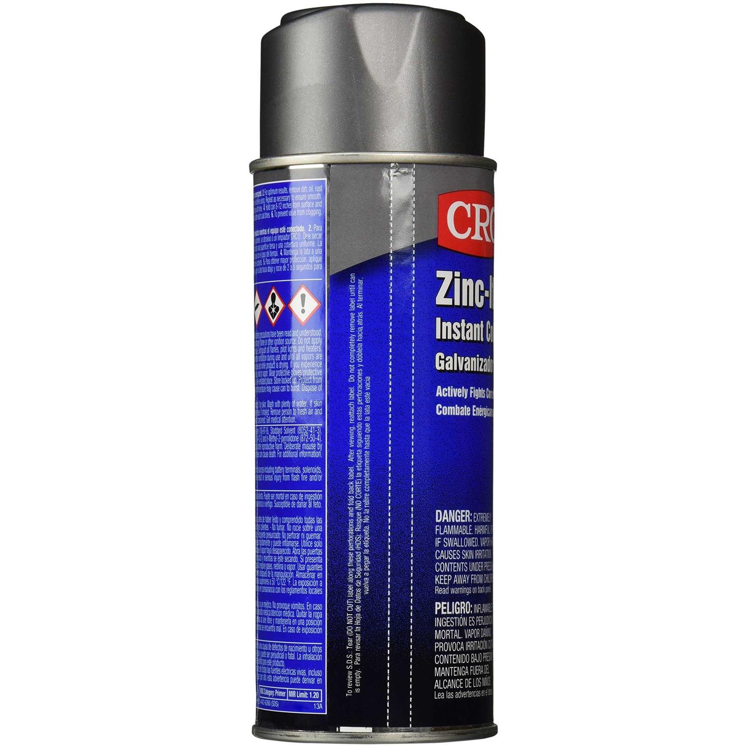 CRC Industries Zinc-It Instant cold galvanize is a sacrificial coating to protect ferrous metals from oxidizing. It is highly-resistant to scratches, dents, corrosive environments, abrasion, salt air, moisture and road salts. It comes in a 16 oz aerosol can. Instant cold galvanize is used in marine, refinery, utility, water treatment, chemical processing, pulp, paper, steel manufacturing, general maintenance and repair.