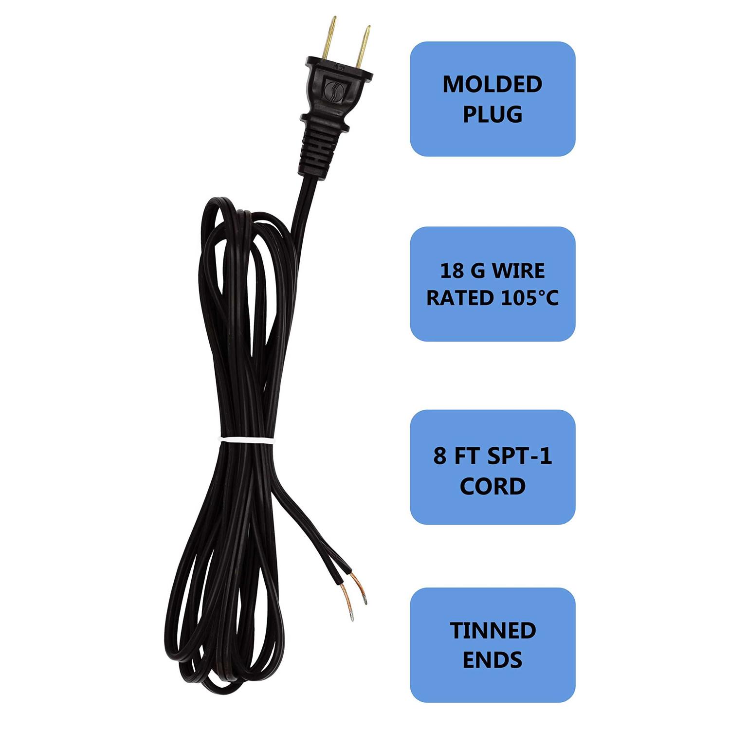 - SPT-1, 18 gauge wire, rated 105°C, Lamp Repair Wire, 8 foot long cord with molded end plug, polarized blades, great lamp parts.