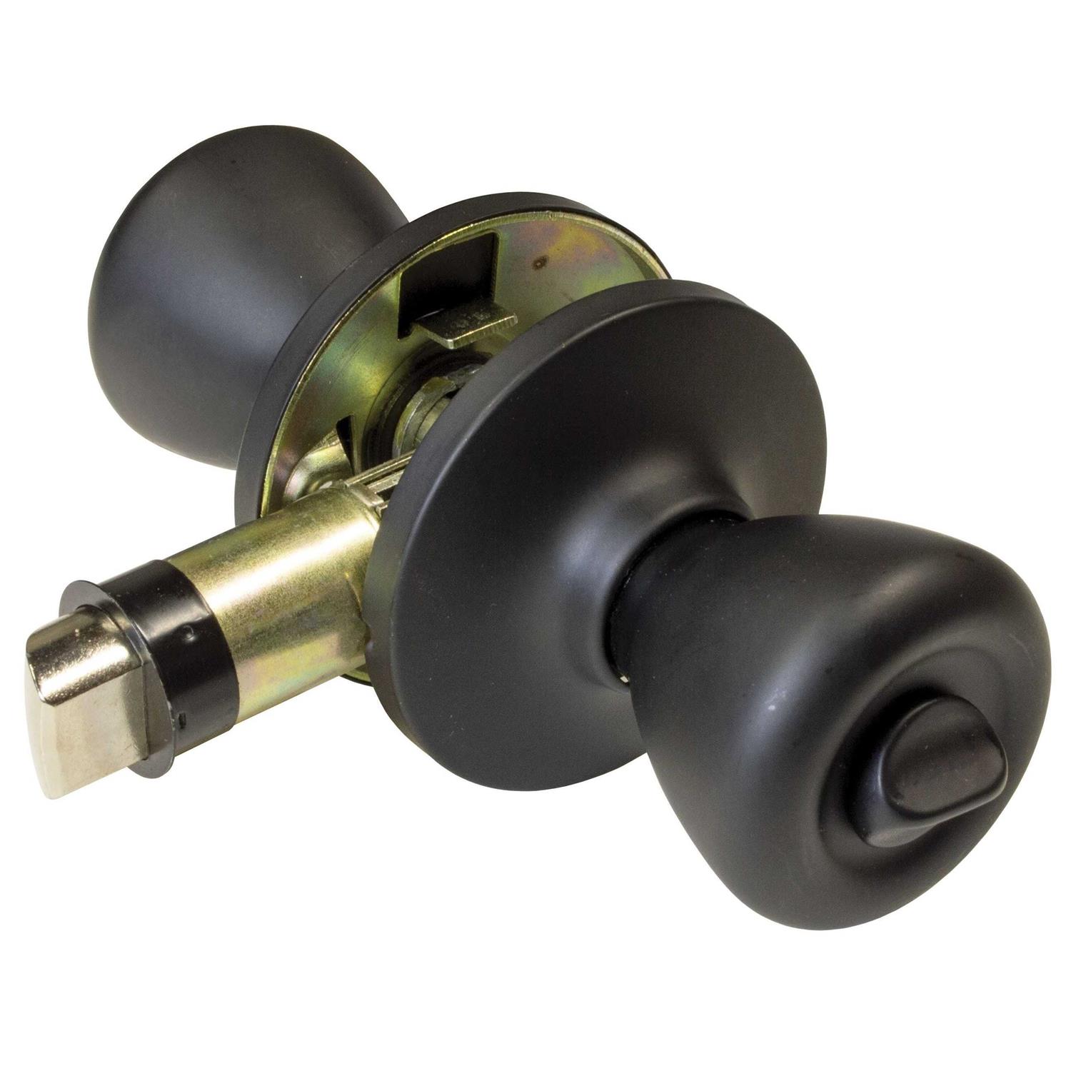 Creative Products Group’s LSK-C3-MB Knob Set is designed for RV bathroom and bedroom doors. It features a privacy-style locking design. The durable brass construction with a matte black finish provides a beautiful addition to any RV interior! Backset: 2-3/8 inch. Latch: 7/8 inch drive-in. Fits doors 1-1/8 inch to 1-1/2 inch thick.