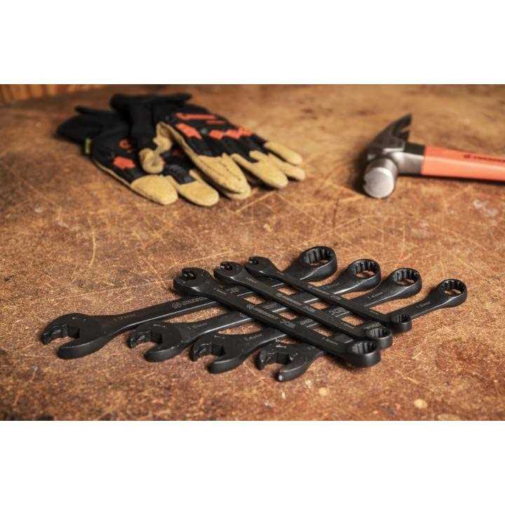 The Crescent X6 Metric Open End Ratcheting Spanners have a smooth profile that allows for more torque to be comfortably applied to the fastener. With a ratcheting open end that turns nuts and bolts without removing spanner from fastener. They fit 6 fastener types Hex Square 12 Pt. E-Torx Rounded Hex and Spline. Includes one of each size 8 10 12 13 14 15 amp 17mm.
