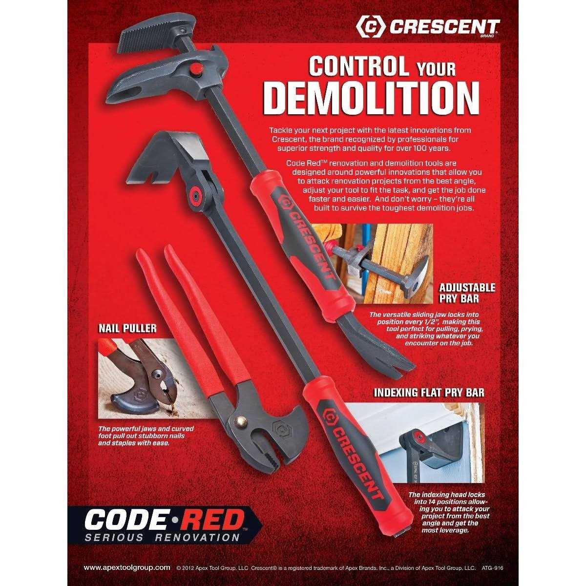 The functionality of the pliers allows you to easily remove nails from the front or back ot the wood. The Crescent NP11 11-inch nail pulling pliers are designed to pull finishing nails, floor staples, wire and coaxial staples, headed nails, brads, damaged fasteners, and pin nails. The dual handle make it quick and easy to grp, roll, and remove nails and staples. The durability of forged steel head and handles create a durable tool with rubber grips for comfort and control. Dual handles for quick, easy grip (view larger). Durably designed for renovation and demolition (view larger). Code Red renovation and demolition tools are designed around powerful innovations that enable you to attack renovation projects from the best angle, adjust your tool to fit the task, and get the job done faster and easier. And they’re built to survive the toughest demolition jobs. What’s in the Box Crescent NP11 11-Inch Nail Pulling Pliers About Crescent Celebrating its 100th anniversary in 2007, the Crescent brand adjustable wrench is the flagship tool and a true American icon. It is prized by tradesmen and homeowners alike for its utility and durability. Today, Crescent offers many other high quality tools, including tongue and grove pliers, locking pliers, screwdrivers, and nutdrivers. NP11 11-Inch Nail Pulling Pliers At a Glance Dual handles make it quick and easy to grip, roll, and remove nails or staples Easily remove nails from the front or back ot the wood Extract nails regardless of size or if head of nail is damaged or removed Forged steel head and handles Rubber grips for comfort and control Product Description Tackle your next project with the Crescent Nail Pulling Pliers, designed to pull finishing nails, floor staples, wire or coaxial staples, headed nails, brads, damaged fasteners, and pin nails. The dual handle makes it quick and easy to grip, roll, and remove nails or staples, and the forged steel head and handles stand up to the rigors of any jobsite.
