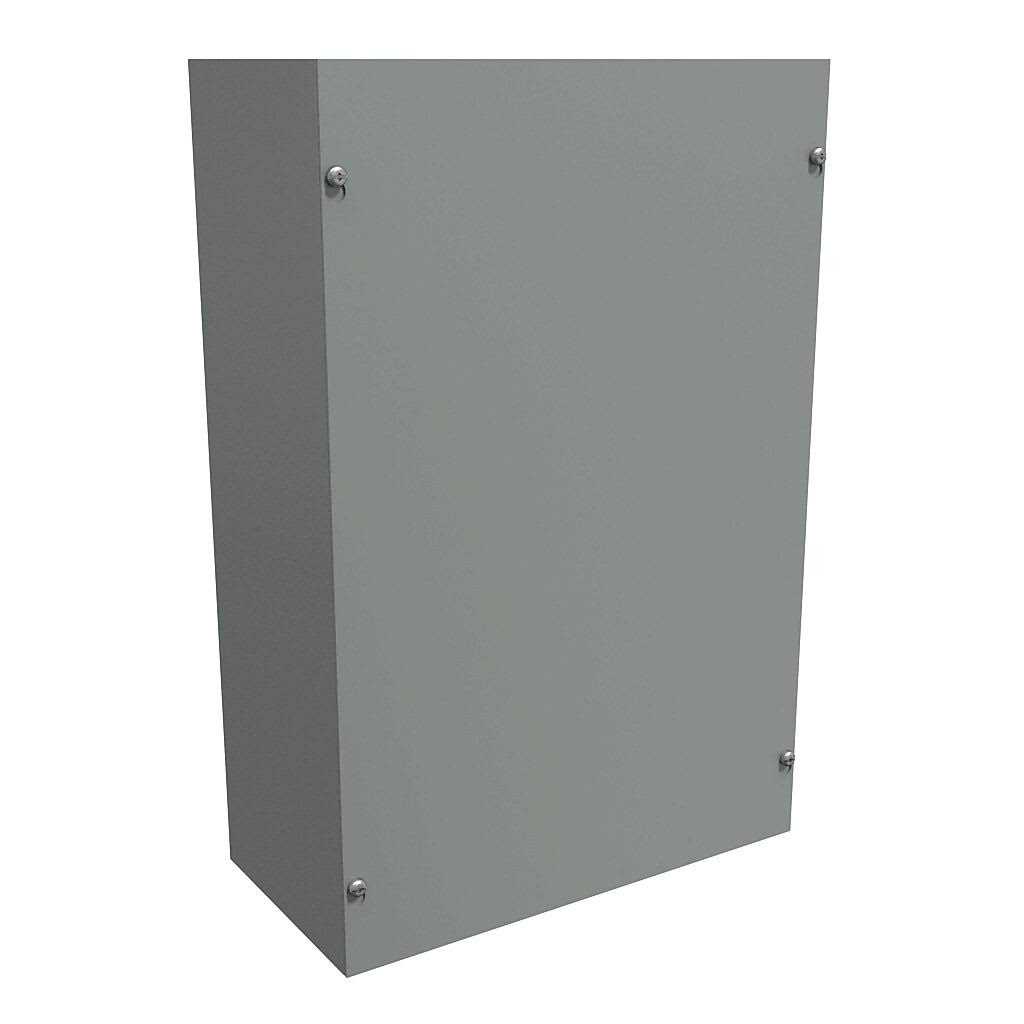 Formed and spot welded from 16, 14 or 12 gauge steel depending on size. Flat steel covers fastened with plated steel screws. Keyhole slots permit cover to be lifted off without removing screws entirely. Through holes in back for wall mounting. Grounding location embossed in body.