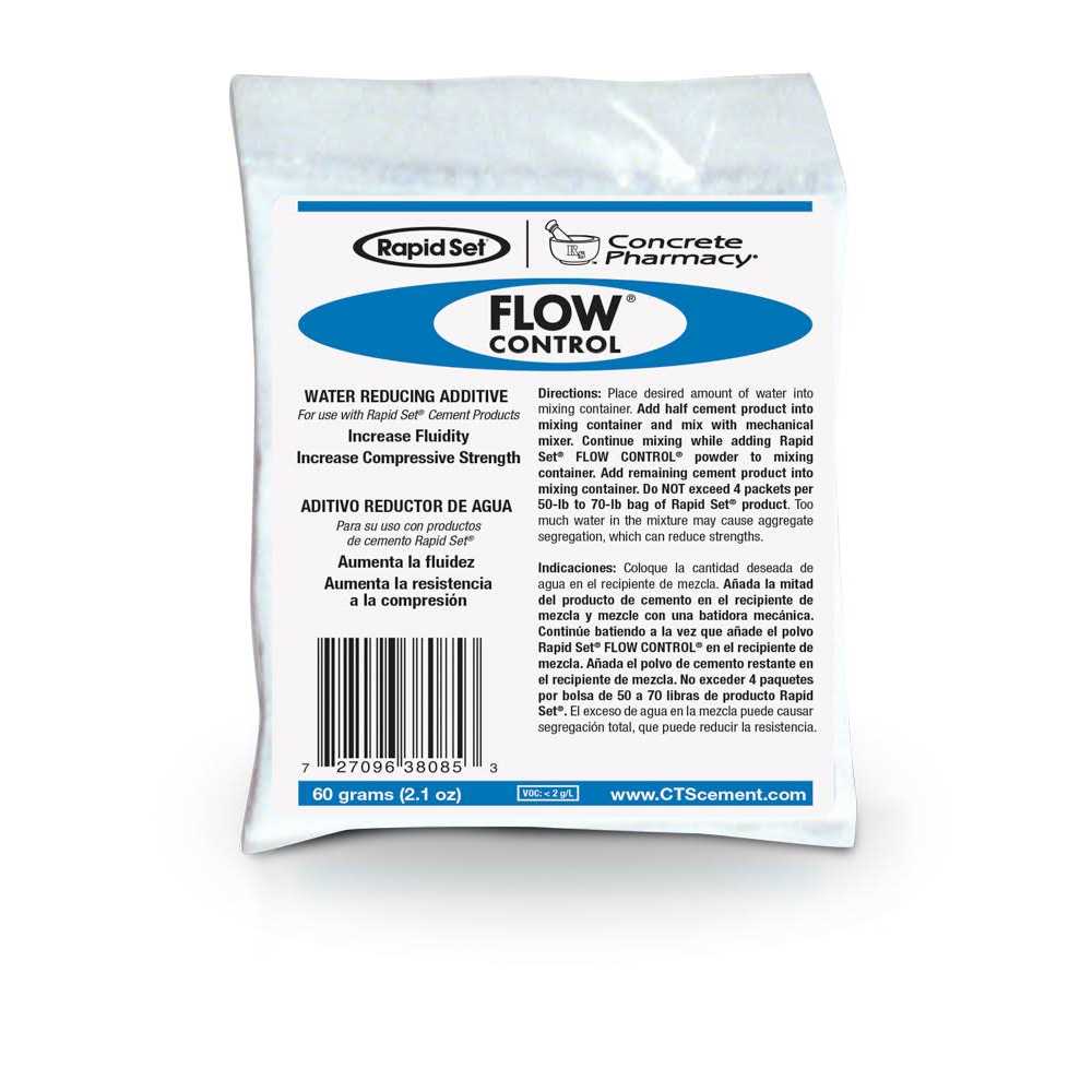 Rapid Set FLOW Control has 2 functions. First, adding FLOW Control to your mix will significantly increase the fluidity of the mixture. Second, FLOW Control increases the strength and reduces the shrinkage of your mixture when you use the FLOW Control as a replacement for mixing water. When using FLOW Control, the same working consistency (or slump) may be produced with approximately 20% to 40% less mixing water. Use enough FLOW Control to achieve desired properties for your mix. Do not exceed 4 packets per 50 lbs. to 60 lbs. bag of Rapid Set cement product. FLOW Control is designed for use with Rapid Set cement products and most other packaged hydraulic cements.