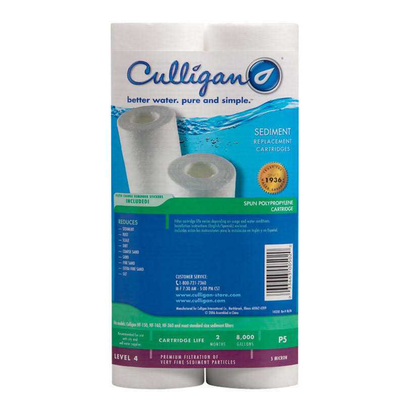 The Culligan P5 water filter is a 5 micron very fine sediment water filter cartridge. Culligan P5 water filters reduce extra-fine dirt, sand, sediment, silt, rust particles, and scale particles. The Culligan P5 water filter is resistant to chemicals and corrosion and designed for purity, bacteria resistance, and chemical resistance.