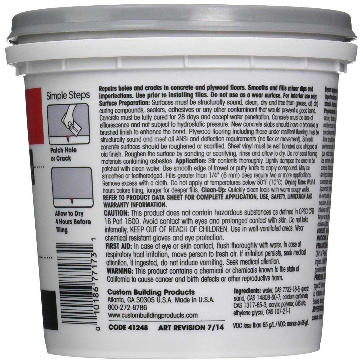 Features: Floor patch. Repairs holes and cracks in concrete and plywood floors prior to installing tile or other flooring. Smoothes and fills minor dips and imperfections. Protected mold guard technology to resist mold and mildew growth.-Areas of use include interior use, concrete, cement backer boards, ceramic tile, exterior grade plywood and vinyl flooring. Do not use as a wear surface. Wait 4 hours before tilling and longer for deeper fills. Pre mixed, quickly clean tools with warm soapy water. Color/Finish: Color: Gray. Dimensions: 5″ H x 5″ W x 5″ D.