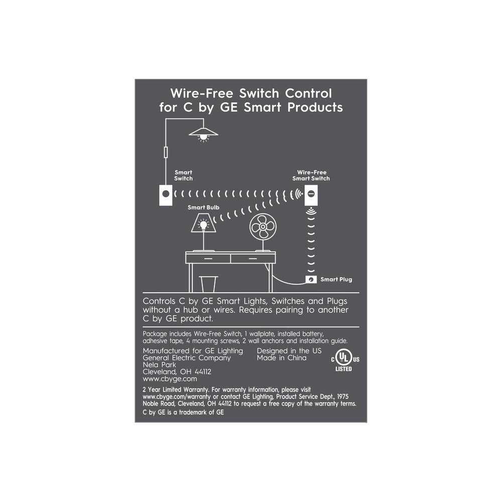 Bluetooth built in lets you adjust the brightness and color temperature of GE smart bulbs, and the removable wall mount requires no wires or screws for easy installation. With a two-year battery life, this C by GE wire-free smart dimmer and color switch sets the brightness level to match your mood or task efficiently. Bluetooth-enabled Allows you to connect to your smart switch for easy management. Touch control Conveniently control your C by GE smart bulbs, switches, and plugs anywhere in the room from your wire-free smart switch. Wirelessly connect multiple switches Lets you wirelessly connect multiple switches and connect switches on different circuits, such as controlling a kitchen light from the hallway. Set brightness level to match your mood or task Dim and brighten traditional lights using touch control or the app. Adjustable color temperature Adjust whites from cool, refreshing light to warm, cozy light from the switch. Creates three-way connections Control the same light from multiple switches without a hard-wired connection. Battery-powered design The battery-powered switch doesn’t require an electrical connection, so you can install the switch on any wall or surface. Long battery life The replaceable battery provides long battery life. Easy installation Remove the adhesive tape, stick to a wall, and set up your smart switch in the C by GE app.