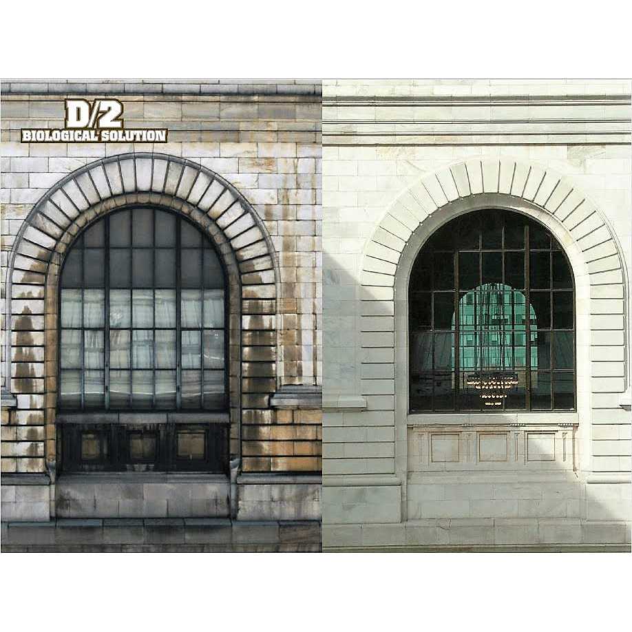 D2 Biological Solution is a biodegradable, easy-to-use liquid that removes stains from mold, algae, mildew, lichens, and air pollutants. It is effective on marble, granite, limestone, brownstone, travertine, masonry, terra cotta, concrete, stucco, wood, and other architectural surfaces including monuments, sculpture, gravestones, headstones, vinyl, and aluminum siding. A contact time of only 10 to 15 minutes followed by scrubbing with a soft nylon or natural bristle brush will loosen most biological and air pollutant staining. It is safe to use and won’t deposit harmful residues! D2 cleaner has been successfully used to remove staining from a variety of surfaces including natural stones such as marble, granite, limestone, sandstone, and slate, masonry surfaces such as brick and cast stone, concrete, wood, aluminum and vinyl siding, and canvas. It works D/2 has been used successfully to clean millions of buildings and monuments. From the White House to Arlington Cemetery, D/2 is trusted to work and keep on working when results matter.