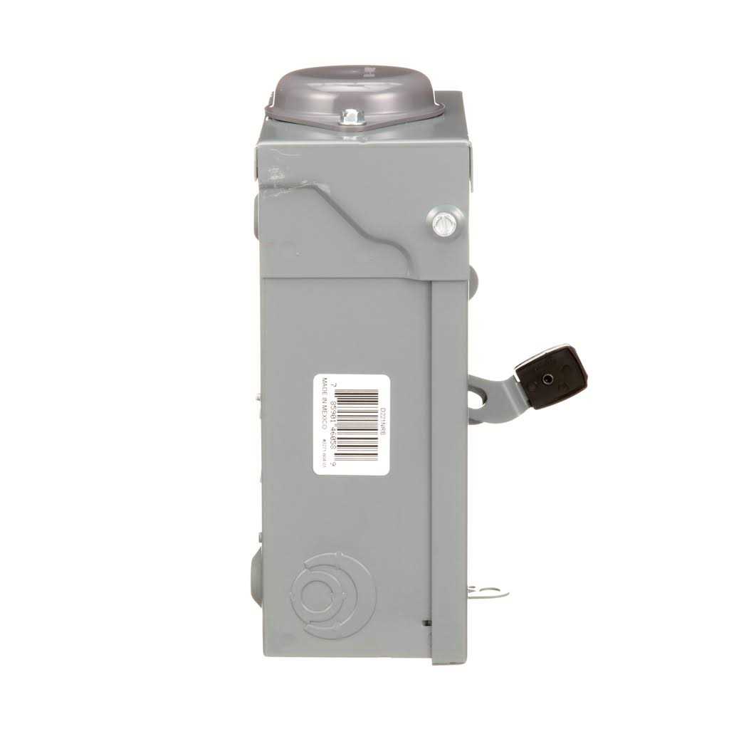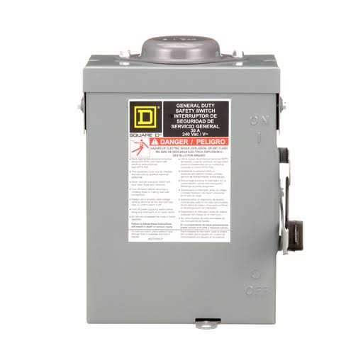 D221NRB Safety Switch 250V/Outdoor, 30A, 2 Pole General Duty Safety Switches General duty safety switches are designed for residential and commercial applications where economy is a prime consideration. Typical loads are lighting, air conditioning and appliances. They are suitable for use as service equipment when equipped with a factory-installed neutral assembly or a field-installed service grounding kit. General duty safety switches are UL Listed, File E2875, and meet or exceed the NEMA Standard KS1. 400 and 600 A general duty switches (NEMA 1 only) will accept Class J fuses and are UL Listed for use on systems with up to 100,000 RMS symmetrical amperes available fault current. 600 A requires Class J fuse kit—GDJK600. 400 A requires moving load base. Class T 400–800 A general duty safety switches, use 300 Vac Class T fuses and are UL Listed for use on systems with up to 100,000 RMS symmetrical amperes available fault current.