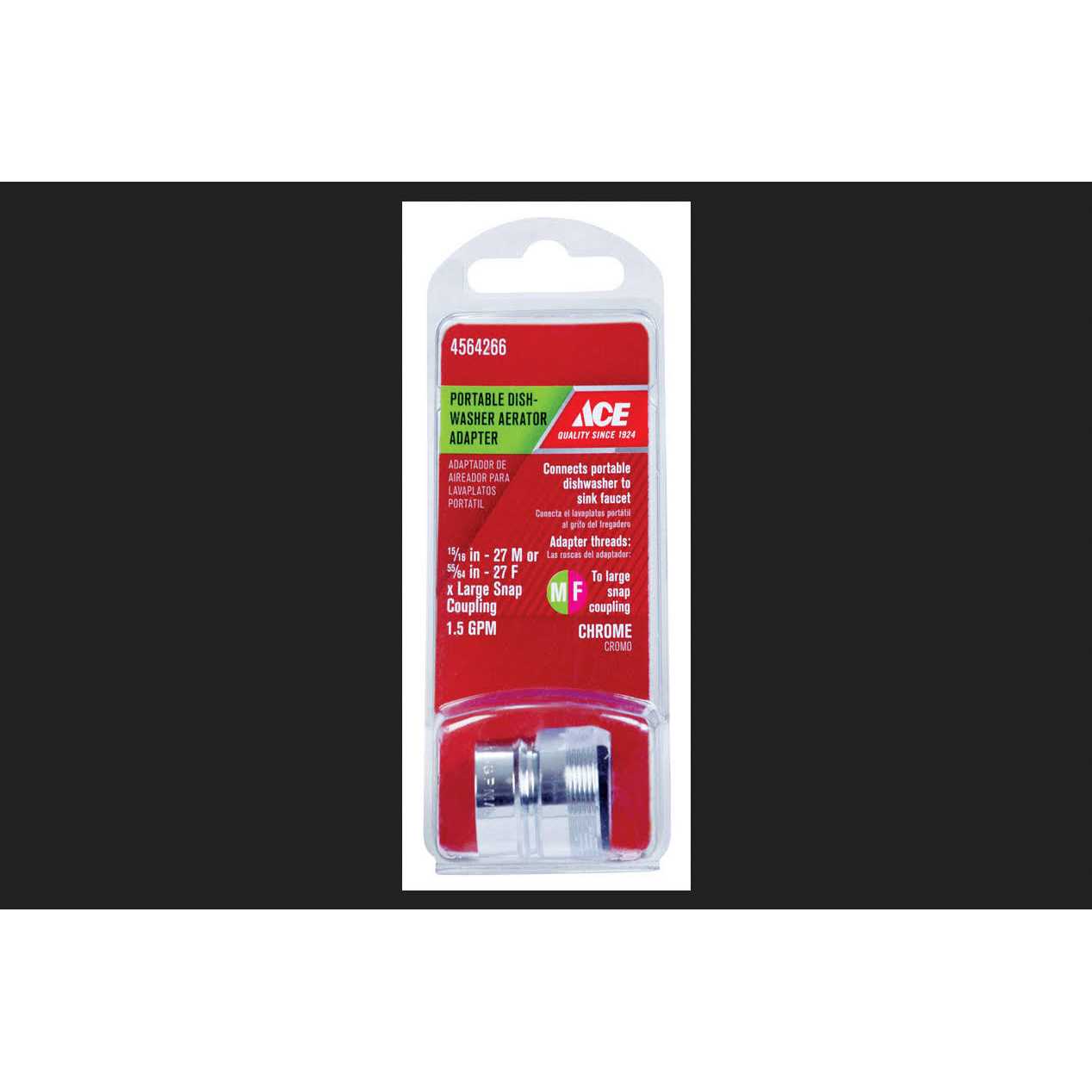 The large fitting aerator adapter connects a portable dishwasher to the sink. This adapter will connect any device with female snap coupling to your sink faucet. It has the full water flow that you need and an easy connection to a dishwasher.