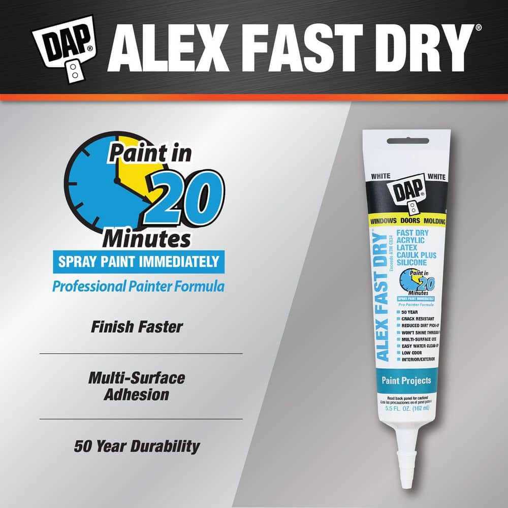DAP Alex fast dry acrylic latex caulk plus silicone is specifically formulated to meet the demanding needs of professional painters and deliver outstanding paint finish results. It can be brush painted in 20 minutes after application or painted with a sprayer immediately, so the job gets done faster. This durable, flexible caulk won’t crack or discolor paint and doesn’t pick up dirt. It applies smoothly and easily, has outstanding adhesion to a wide variety of surfaces and provides a 100% waterproof seal. Ideal for sealing cracks and gaps around windows, doors, baseboards, molding and trim. Color: White.