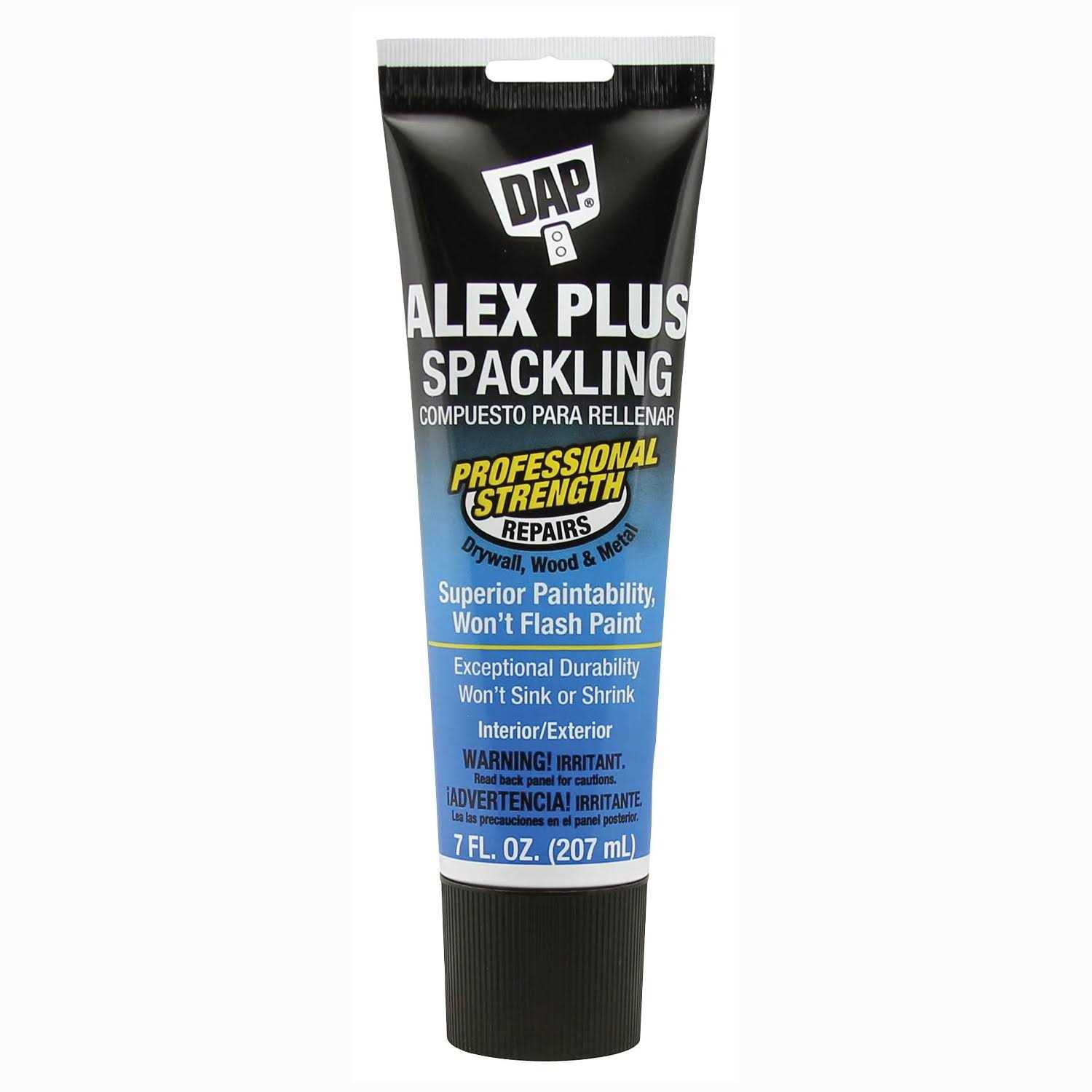 DAPĀ ALEX PLUSĀ spackling is a premium spackling for filling holes and cracks in surfaces such as drywall, plaster, wood, brick, metal and stone. Its ready-to-use smooth, white formula spreads easily for fast, professional repairs that will not crack, crumble or flake. It has a desired texture for excellent tooling and easy smoothing to a feather edge. ALEX PLUSĀ Spackling sands effortlessly. It can even be finger sanded – no sandpaper needed when sanding small nail holes or hammer dents in drywall. Just use finger to smooth dried spackling before painting. ALEX PLUSĀ Spackling provides superior paintability. It does not flash or gloss low sheen or flat paint. It accepts paint like bare drywall or other porous surfaces and provides a very smooth surface that disappears when painted. ALEX PLUSĀ Spackling dries quickly, but has a long working time and will not gum up on knife.