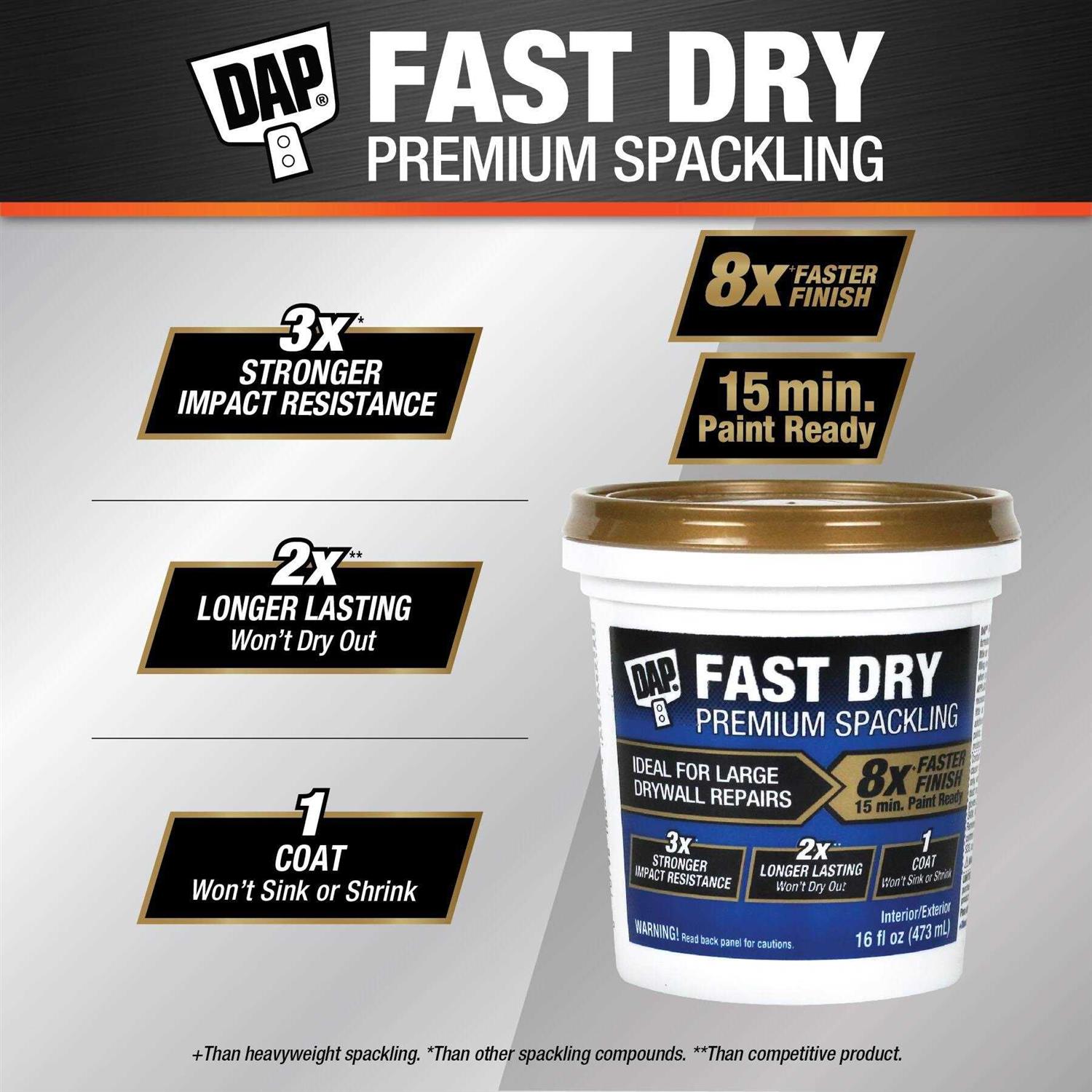 DAP Fast Dry Premium Spackling is a professional-grade spackling compound uniquely formulated to provide strength and durability like traditional heavyweight spackling, but also dries fast and can also be painted in as little as 15 minutes. Its ready-to-use, smooth formula spreads easily and won’t sink, shrink or crack, filling even the largest of drywall repairs in one coat. This spackling putty is 3 times stronger and last 2 times longer than other items. It can be used inside or outside and is ideal for large drywall repairs. Product is off white. The selling unit is 16 oz.