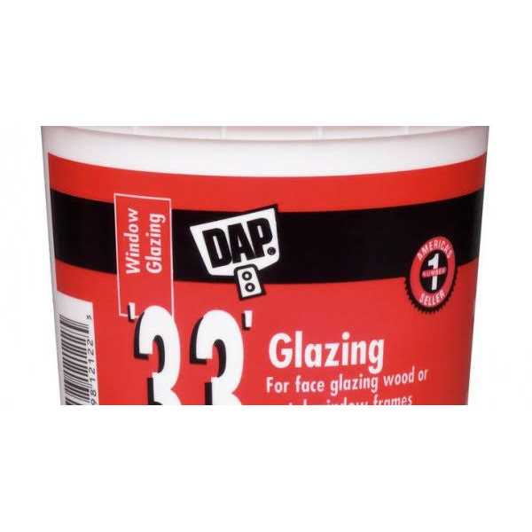 DAP 33 Glazing is a ready-to-use glazing compound that may be used for face glazing wood or metal sash. Its knife-grade consistency allows for smooth, easy applications and sticks tightly to glass and sash while resisting sagging, shrinking and cracking. This product is designed for both interior and exterior use.