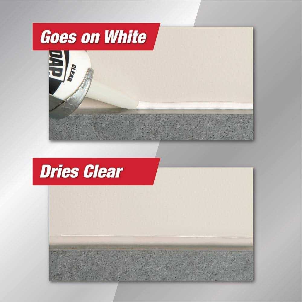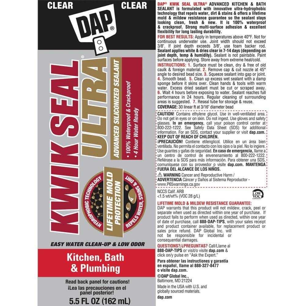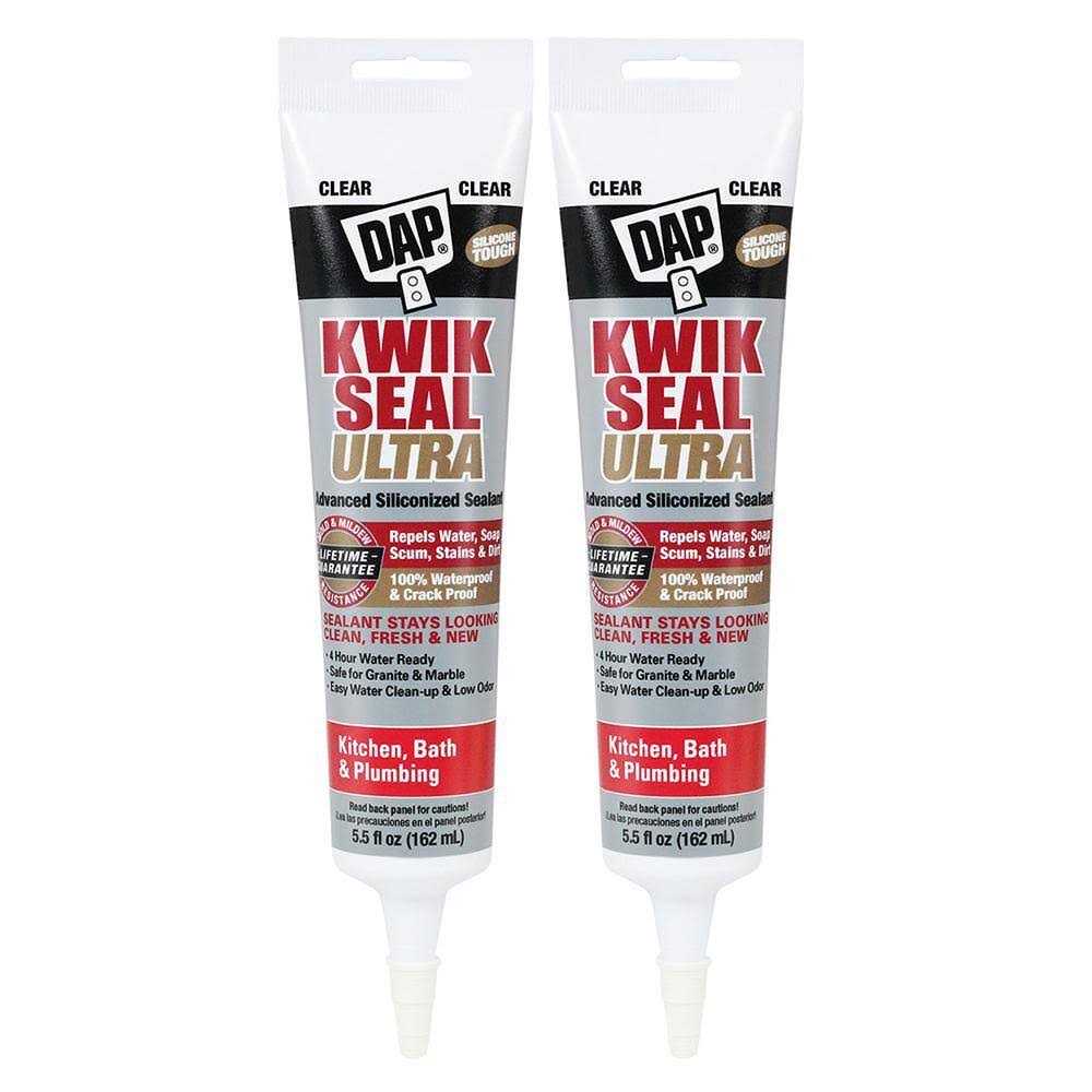 DAP Kwik seal ultra is a high-performance siliconized kitchen and bath sealant that repels water, stains and dirt and has a lifetime mold and mildew guarantee so that the sealant stays looking fresh and new. Sealant is 100% waterproof and crack proof and can be exposed to water in as little as 4-hours after application without washing out. It is easy to apply and tool and cleans up easily with water. Seal out water and moisture around sinks, tubs, showers, faucets, vanities, counter tops and fixtures. Color: Clear.