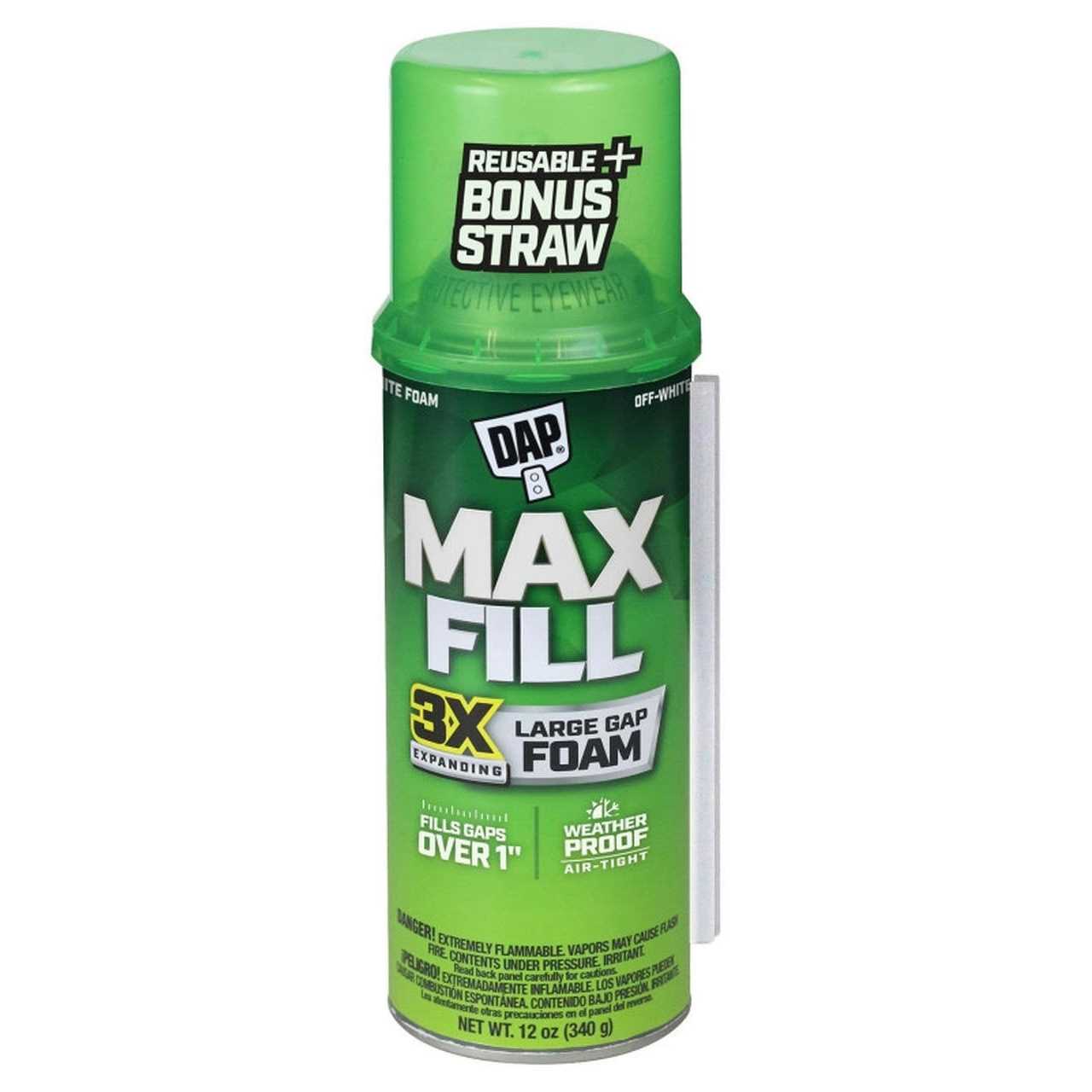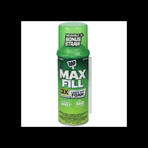 DAP Touch n’ Foam Max Fill DAP Touch n’ Foam Max Fill is the original maximum expanding sealant formulated to fill gaps andvoids all around the home. Max Fill provides three times the expansion to fill gaps greater than 1 inch wide.Its weather-resistant bond seals out drafts and moisture. It can be used indoors or outdoors, is paintable,and comes with a reuse adapter saving the can for multiple projects.Our maximum expanding formula, in the familiar green can, is the original Touch ‘n Foam sealant formulated to fill gaps and voids all around the home. Max Fill provides three times the expansion to fill gaps greater than 1 inch wide. Its weather-resistant bond seals out drafts while blocking insects and other pests. It can be used indoors or outdoors.