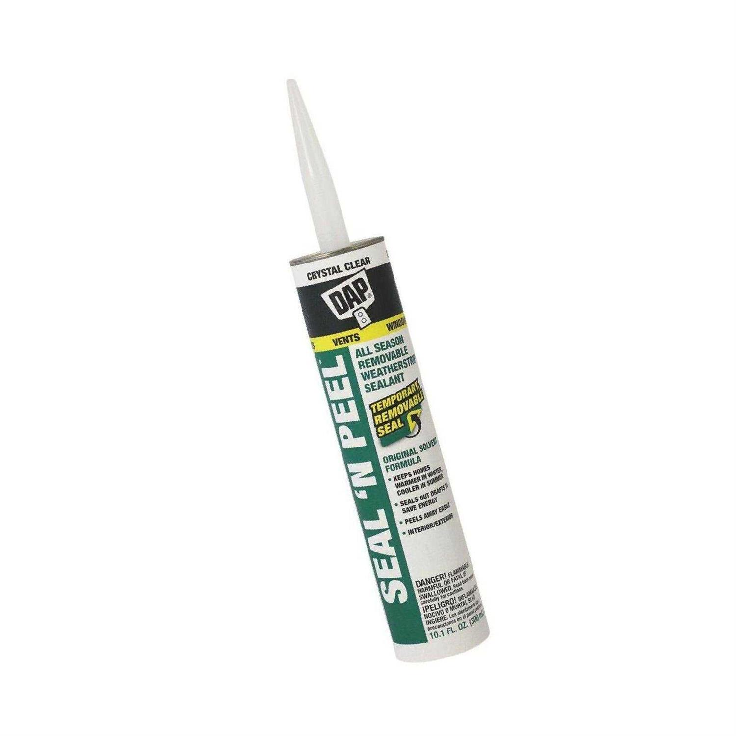 Removable sealant improves energy efficiency and control temperatures around windows, doors, and other areas of the home. Provides a watertight, weatherproof and fast drying temporary seal against air and moisture. Adheres to glass, plastic, ceramics, aluminum, wood, fiberglass, drywall, concrete, vinyl, and painted surfaces. Ideal for sealing window and door frames, vents, fans, patio doors, air conditioners, and louvers. Removable sealant applies like a sealant and peels away easily when no longer needed to seal out drafts. Use year round to keep home warmer in winter and cooler in summer. Goes on white, dries clear. Interior/exterior use Application Temperature 40 F To 100 F Color Clear Color Family Clear Coverage 55 LFT at 3/16 In. Bead Cure Time 7 Days Dries To Touch 10 Min. Gap Span 1/4 In. x 1/4 In. Heat Resistant No Indoor/Outdoor Indoor/Outdoor Longevity 12 Mo.