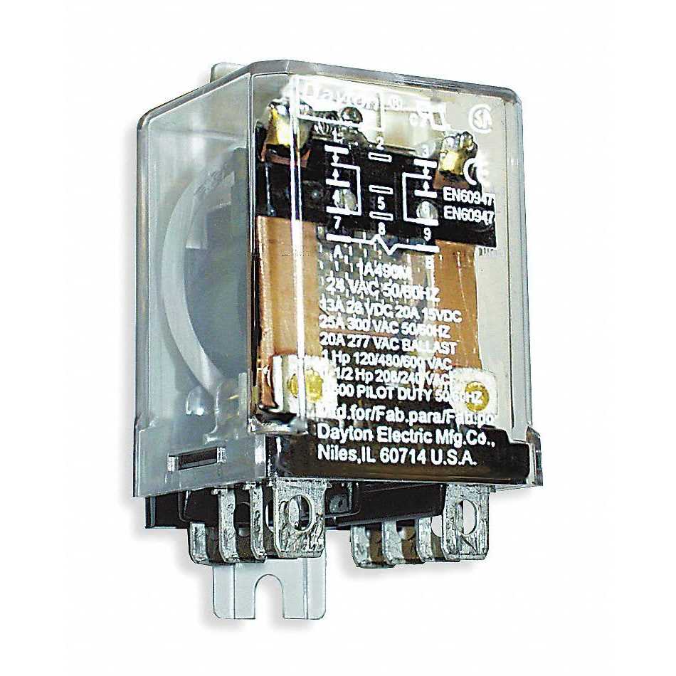 5-Pin Dayton Flange-Mount Power Relay features a side flange and flag indicator. Silver alloy contact material. – UL Recognized, CSA and CE Certified – 6050 Hz Enclosed Power Relay, 8 Pin, 24VAC, DPDT