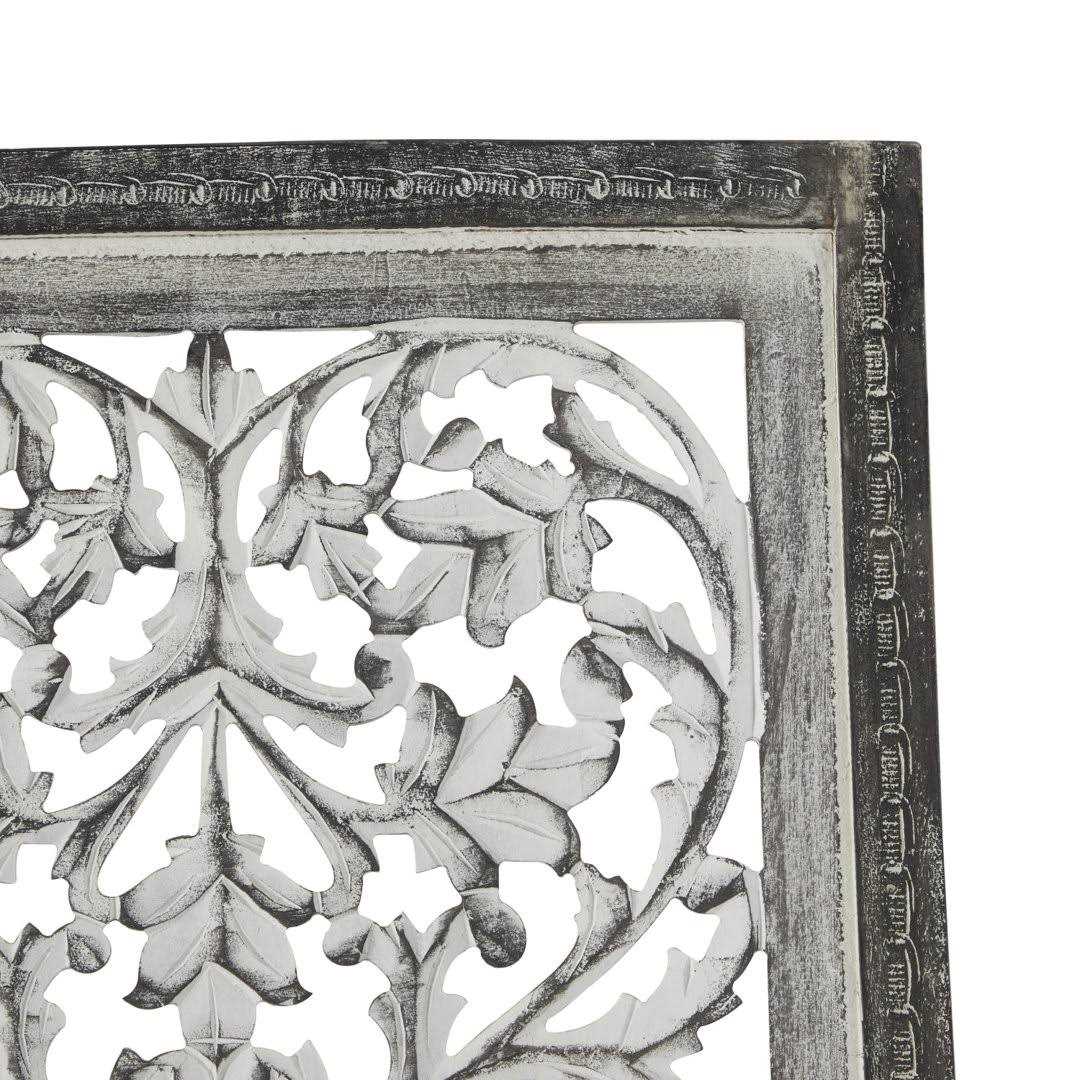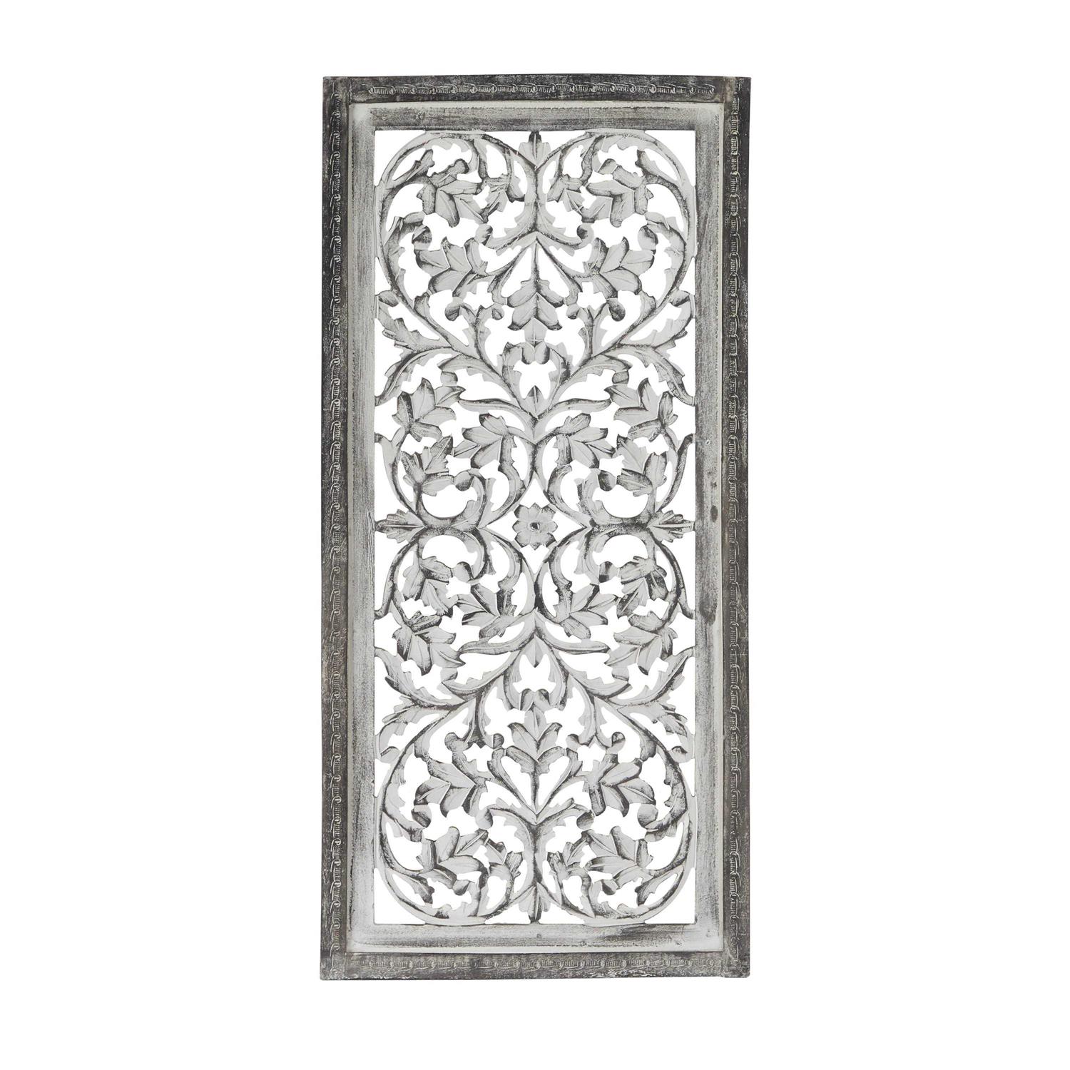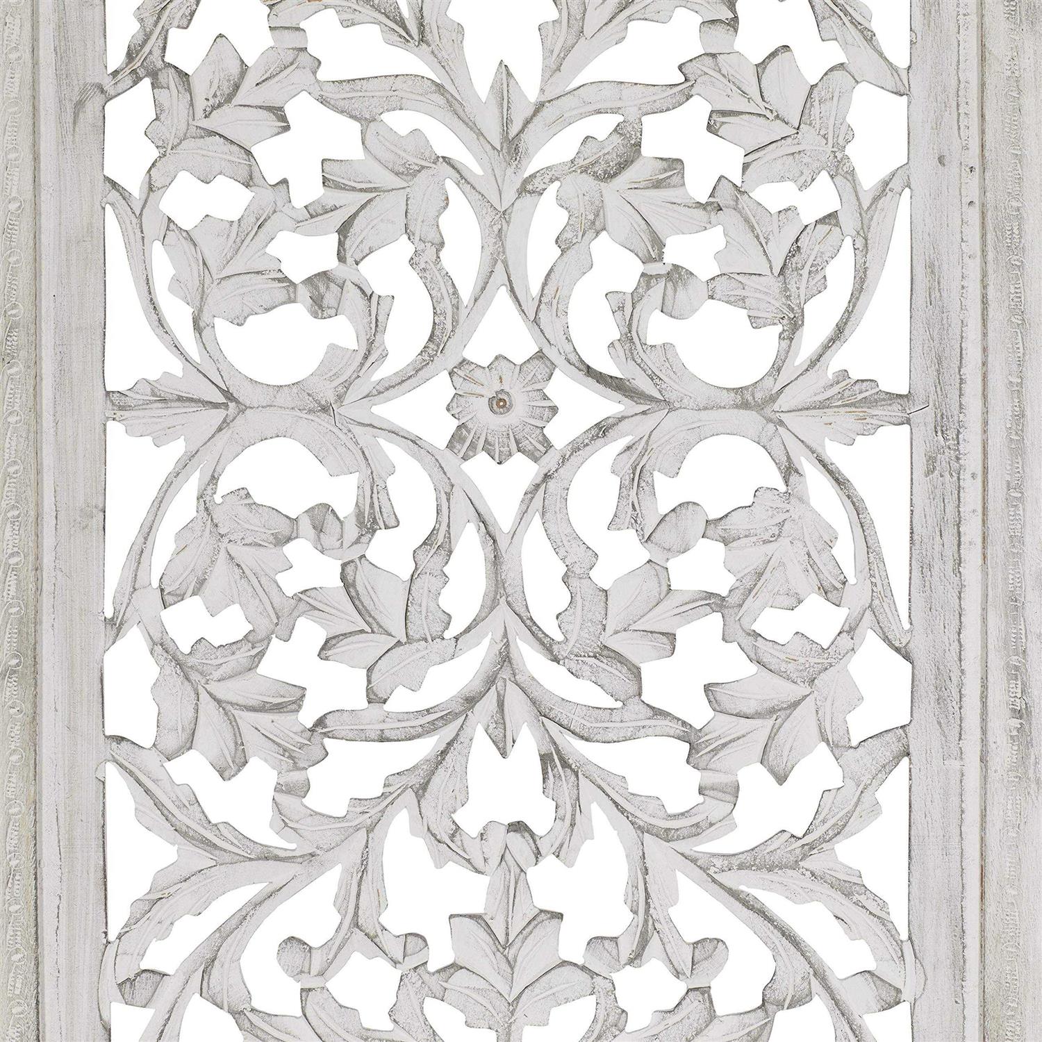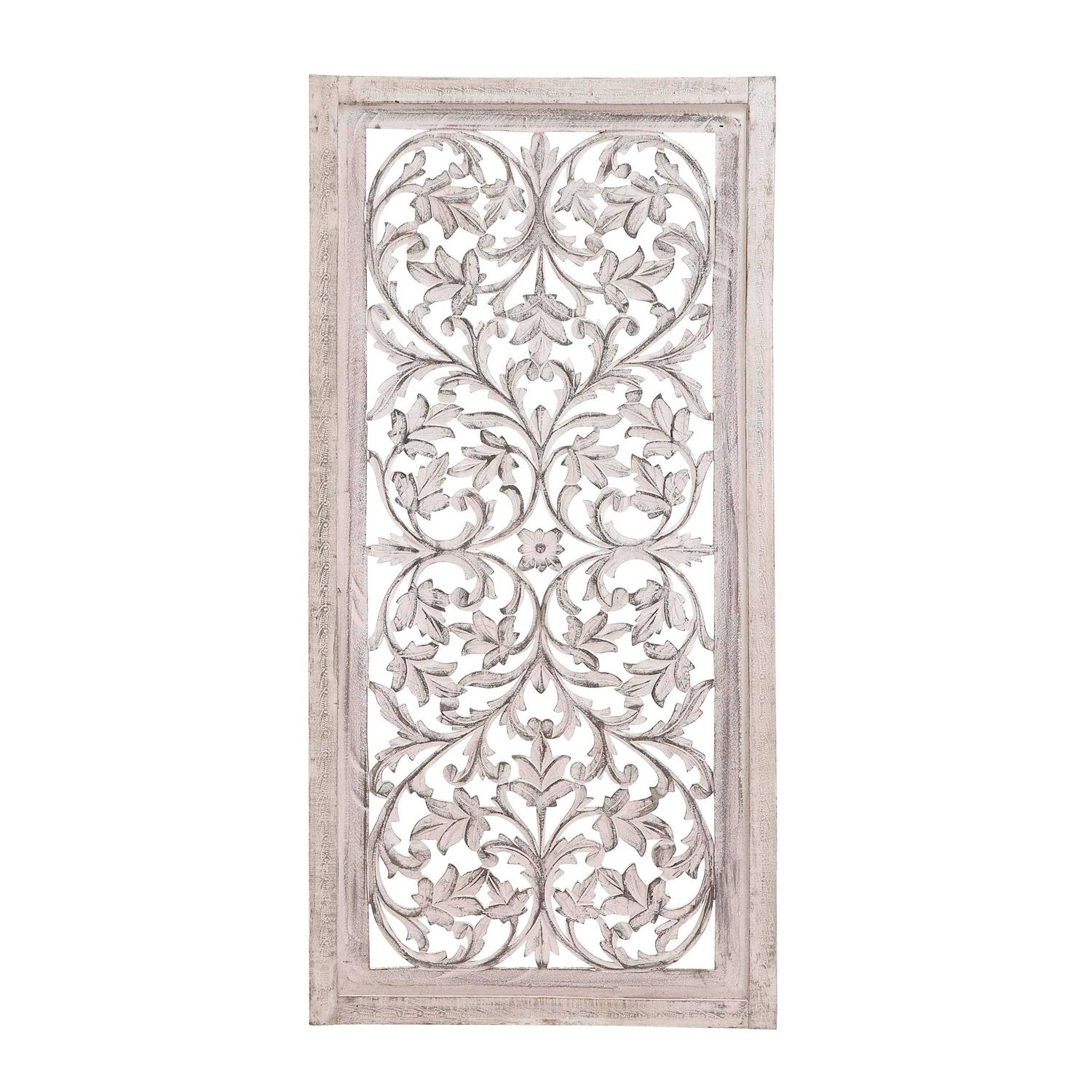 This wood wall decor features carved acanthus, flower, and leaf sculptures throughout the tall, rectangular decorative wood panel. It was hand-crafted in India and given a distressed whitewashed finish that accentuates the wood grain and ornate details while creating a neutral hue that pops against colorful walls and integrates into any color palette seamlessly. However, it is best appreciated with traditional-themed metal and wood furniture pieces. This 51 inchL x 24 inchW wooden wall art decor hangs via metal backing hardware. Due to the handmade nature of this item, no two will be alike, there will be slight differences in shape, size, and color. Suitable for indoor use only.
