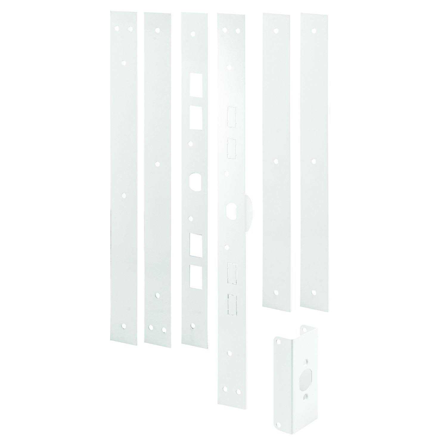 Used to repair and reinforce damaged and vulnerable area of door jamb 1-15/16 in. x 59-1/2 in. when all components are installed White in color Constructed of steel This kit is used to repair broken or split door jambs. The dual plate design provides up to 12 gauge thickness. The kit includes 2 edge guards for 1-3/4in. thick doors. The repair/reinforcement plates include knockouts for a variety of deadbolt spacing. This kit is used to repair broken or split door jambs. The dual plate design provides up to 12 gauge thickness. The kit includes 2 edge guards for 1-3/4in. thick doors. The repair/reinforcement plates include knockouts for a variety of deadbolt spacing.