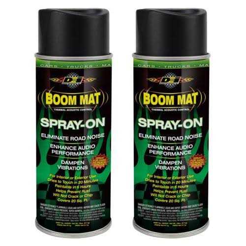 Reduce unwanted road noise and vibration Won’t crack or chip Helps prevent rust Paintable in 6 hours Single can will cover approximately 20 sq. ft. Boom Mat Spray-On sound deadening is perfect for reducing unwanted road noise and deadening vibrations in those hard to reach places such as trunk interiors, fender wells, undercarriage, body panels, rear quarters and inside door panels to name a few. Boom Mat Spray-On also serves as a thermal barrier insulating against unwanted heat. Boom Mat Spray-On can be applied in multiple layers for even more sound deadening while handling temperatures up to 300 degrees F. Can be applied to non-coated surfaces and can be top coated with paint after only 6 hours of dry time.
