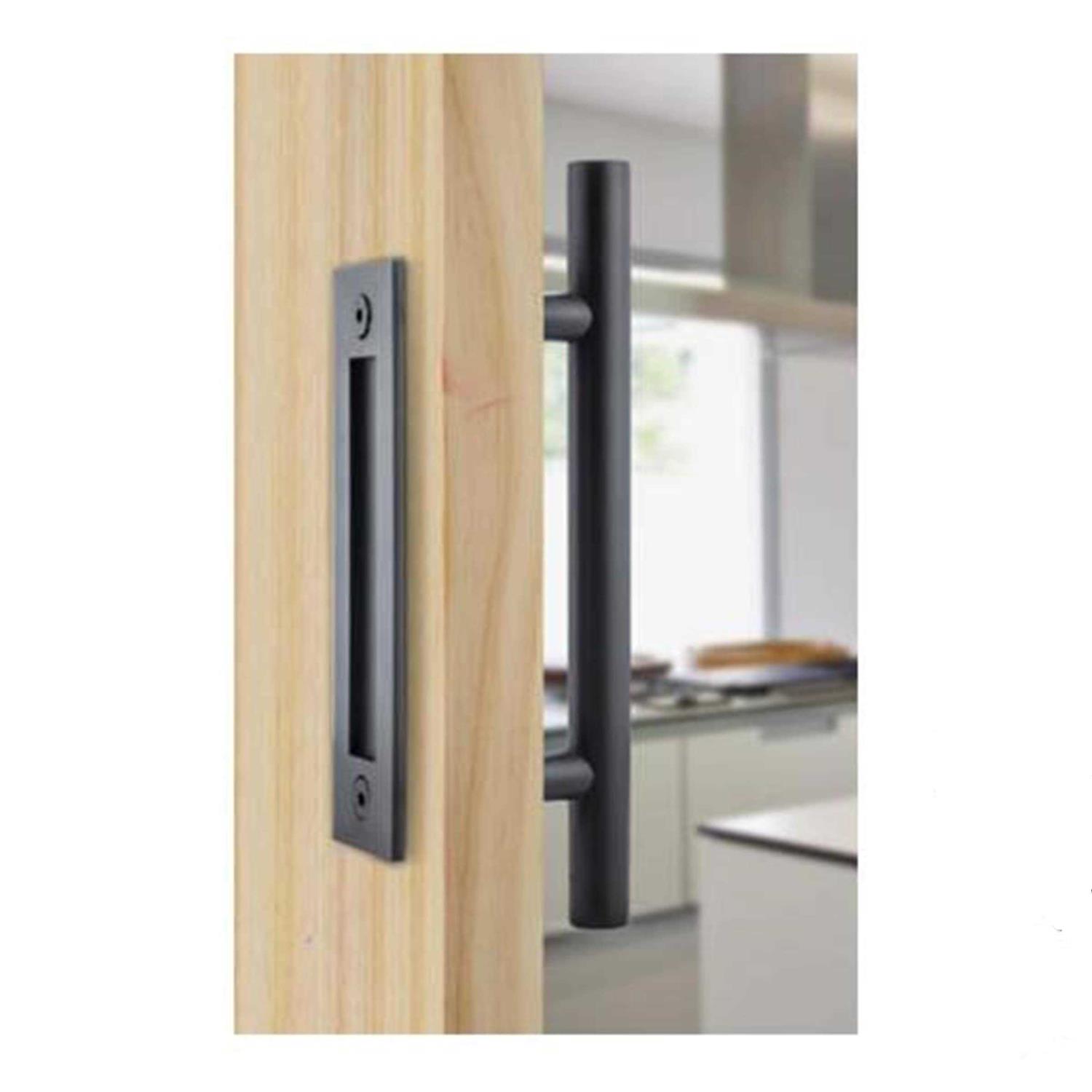 The barn door combo flush with round pull handle is sleek and slim in design. It’s versatile look coordinates well with modern, contemporary and industrial designed barn doors. It measures 15.75 inches in height and is surface mounted with two through bolts. It is paired with a flush pull on the opposite side of the door. It is available in black and brushed steel.PROP 65 WARNING: This product can expose you to some kind of chemical, which is known to the State of California to cause cancer.