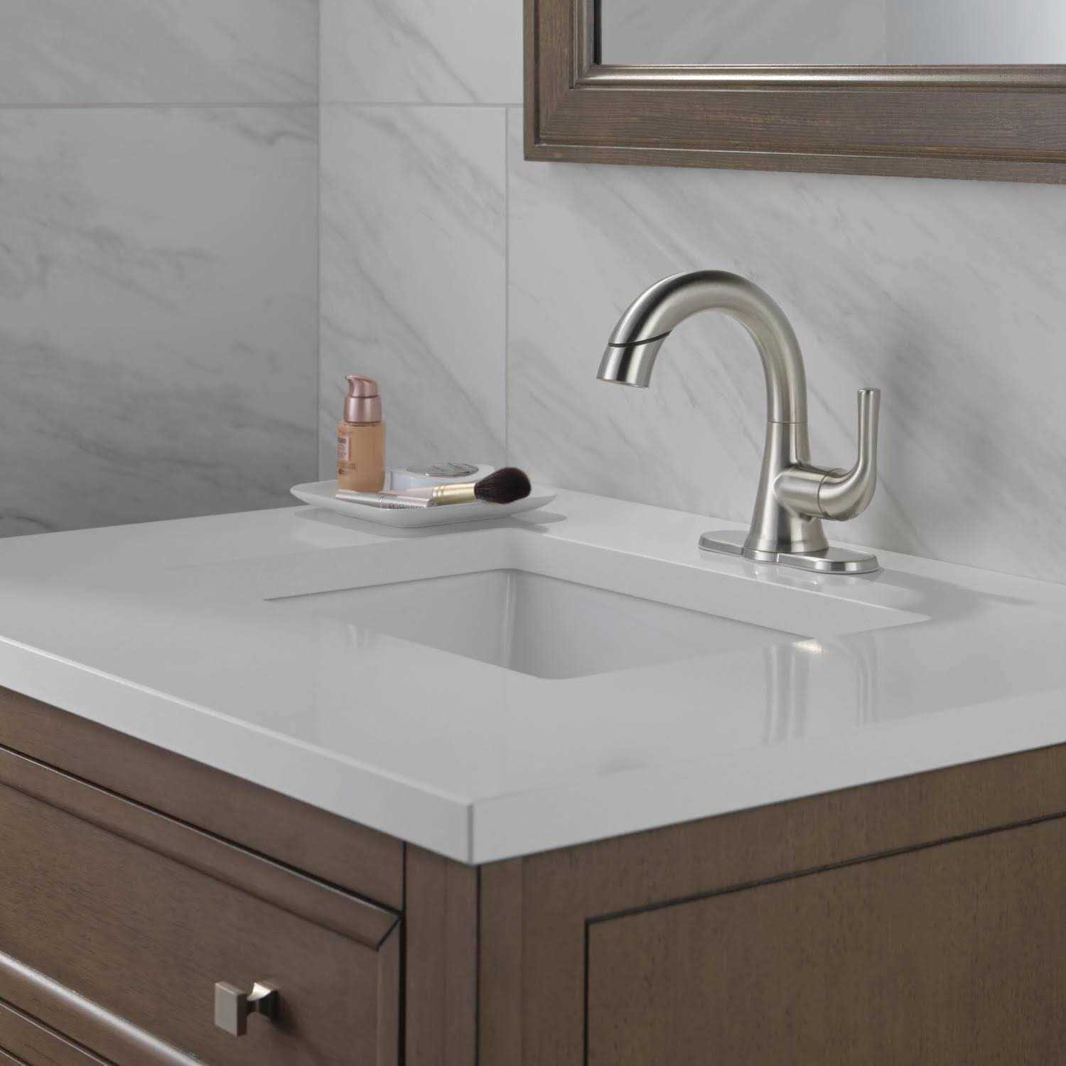 The stretched feminine form and unbroken lines of the Kayra Bath Collection create a clean, flowing design. Delta WaterSense labeled faucets use at least 20% less water than the industry standard—saving you money without compromising performance. Kayra Collection The stretched feminine form and unbroken lines of the Kayra Bath Collection create a clean, flowing design with an integrated pull-down spray wand that simplifies cleanup. Who is Delta? One of the most well known faucet brands, Delta is dedicated to innovative products, modern designs, and latest water technology. Delta products for bathrooms and kitchens feature the best materials, finishes, styles and innovations such as touchless faucets, two-in-one showers, and more. Features: Laminar flow lends a beautiful, refined look that complements the design of the faucet Fits 1 or 3-hole 4 in. installations with optional deck plate (included) Includes optional 5-15/16 in. deck plate Includes matching finish metal push pop-up drain assembly ADA compliant WaterSense labeled faucet uses at least 20% less water than the industry standard without compromising performance Rigid spout Mounting depth accommodates 3 cm granite surfaces Water Conservation Requirements Water efficiency standards for plumbing products such as faucets, toilets, and showerheads vary state to state.