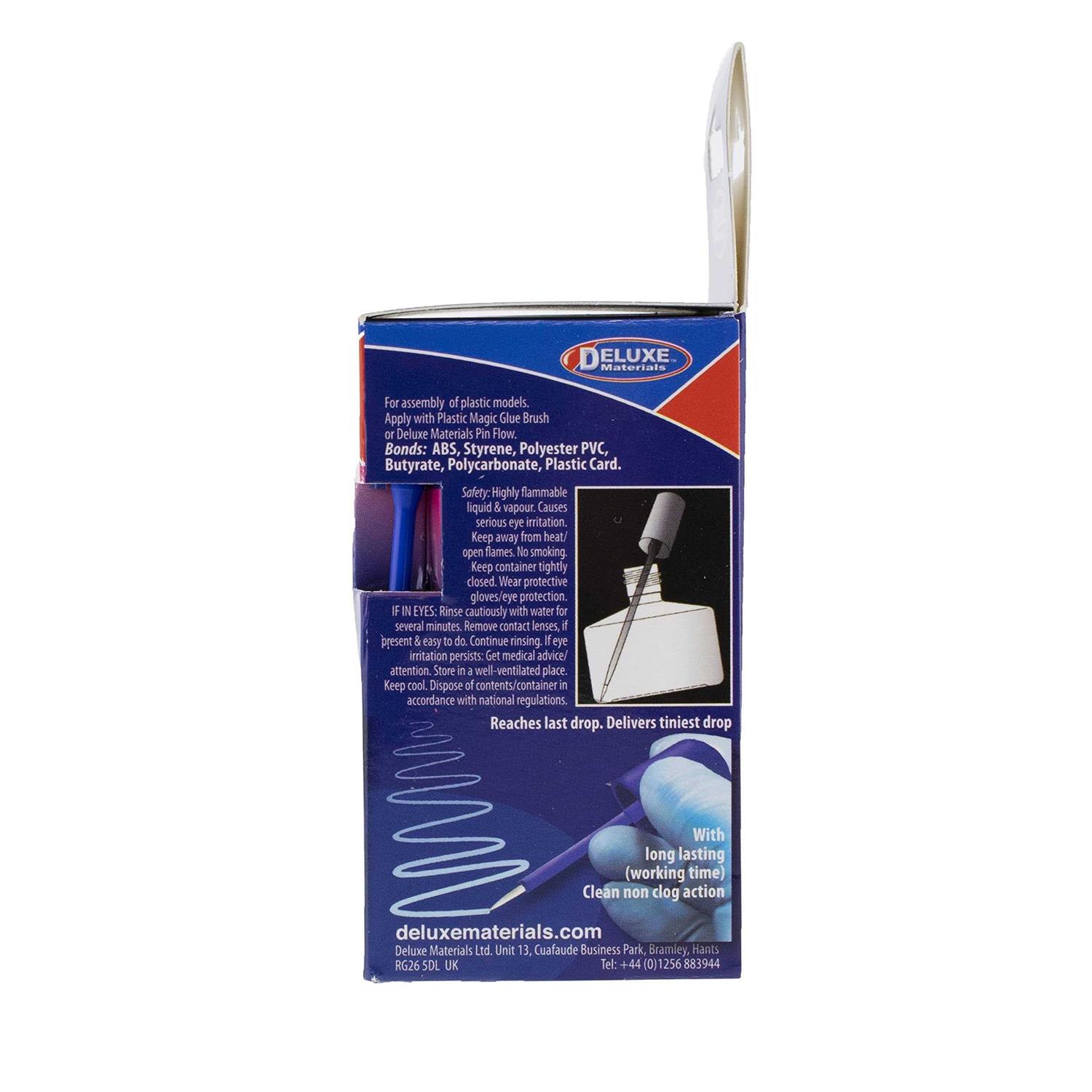 The new formula Plastic Magic is a liquid solvent glue that produces invisible glue lines. The new safer formula can be applied with the Deluxe Materials Pin flow solvent glue applicator or conventionally with a fine paint brush. Plastic Magic bonds nearly all commonly used modelling plastics including polyester, styrene, ABS, PVC, butyrate, and Polycarbonate. The thin formula is great to get into small crevices using the optional Pinflow applicator (S-SE45).