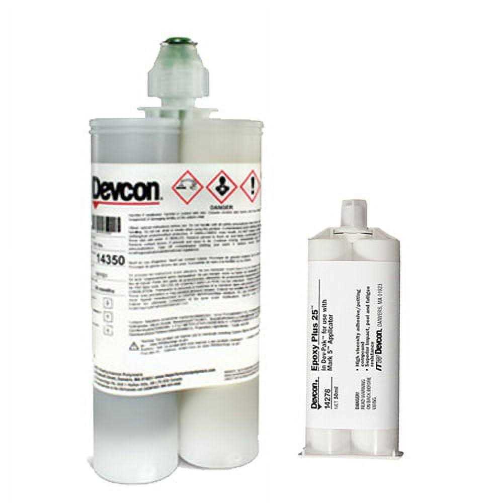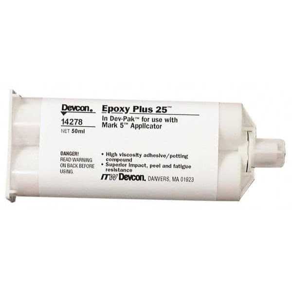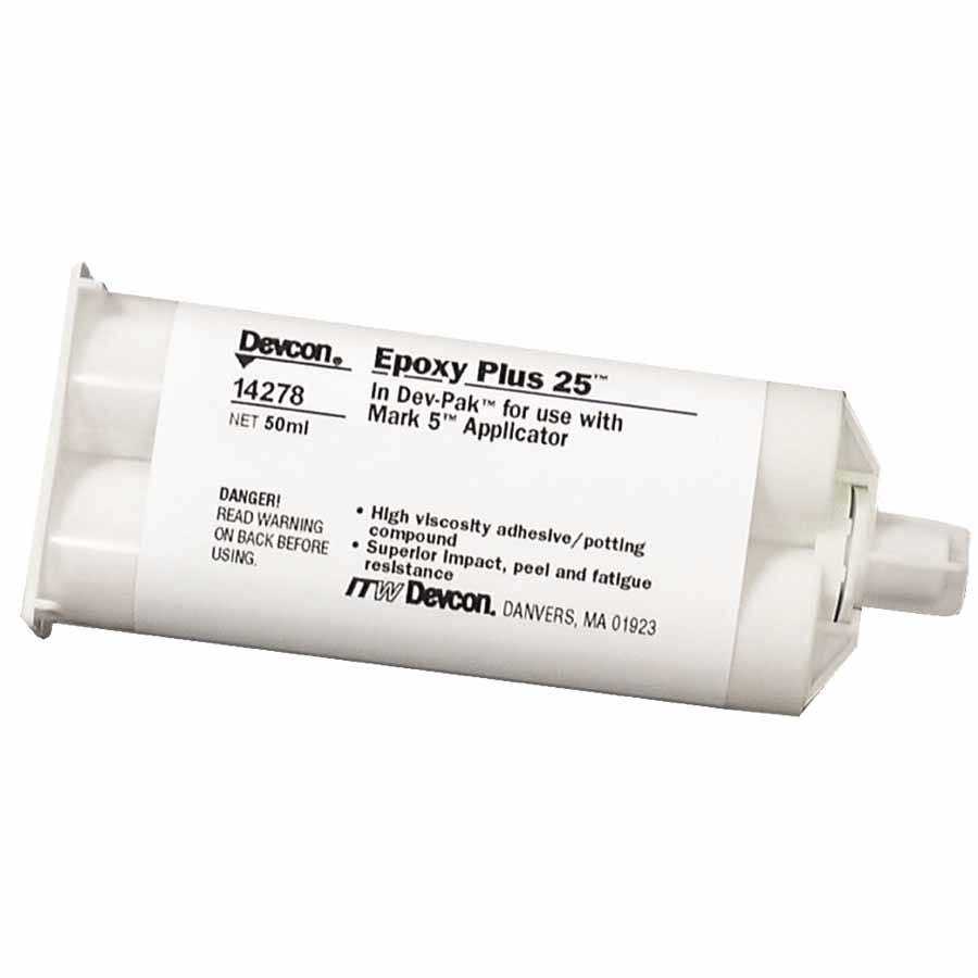Epoxy adhesive, rubber-toughened, high impact and fatigue resistance, gray, 50ml cartridge, dev-paktm cartridge, mixing ratio 1:1, application time 25 min, full cure 30 hr, work life 25 min, substrates metals, frp composites, rigid plastics, concrete, glass, and wood, for the structural bonding, repairing and encapsulating of industrial, automotive, and electronic components, non-corrosive, high peel strength, impact and fatigue resistant restrictionshazardous material epoxy, urethane and acrylic adhesivesdevcon epoxy plus 25nonshrinking, high-viscosity structural adhesive has high dielectric strength. Bonds metals, thermoset plastics, structural parts.