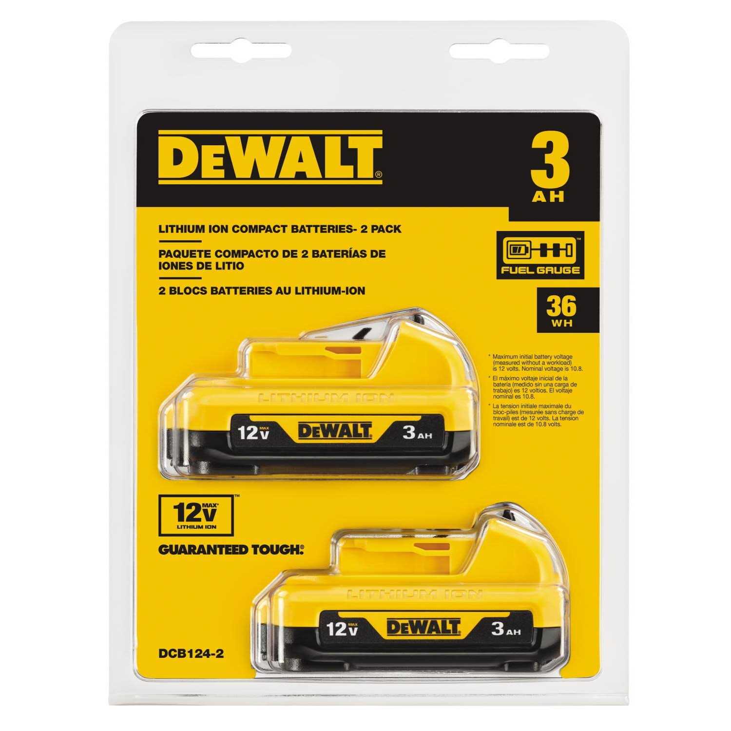 The DCB124 12V MAX 3Ah lithium ion battery provides additional run time for DEWALT 12V MAX tools, with 50% more capacity than the DCB122 2Ah battery. The DCB124 includes the Fuel Gauge LED charge indicator, making it easy to check that your battery is ready for the job. Two pieces per pack.