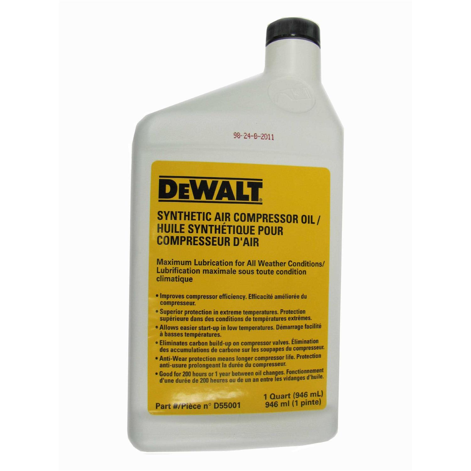 The Dewalt D55001 all-weather synthetic compressor oil is an ISO-100 viscosity (equivalent to 30 weight) non-detergent oil. This Dewalt air compressor oil improves efficiency while offering superior protection in extreme temperatures, and provides maximum lubrication for your compressor. The D55001 eliminates carbon build-up on compressor valves and allows an easier start-up in low temperatures. The Dewalt D55001 includes anti-wear protection, increasing your compressor’s life. This air compressor pump oil is good for 200 hours, or one-year between oil changes. The D55001 compressor oil can be used with Dewalt, Rol-Air, J-Air and any other air compressors requiring pump oil.