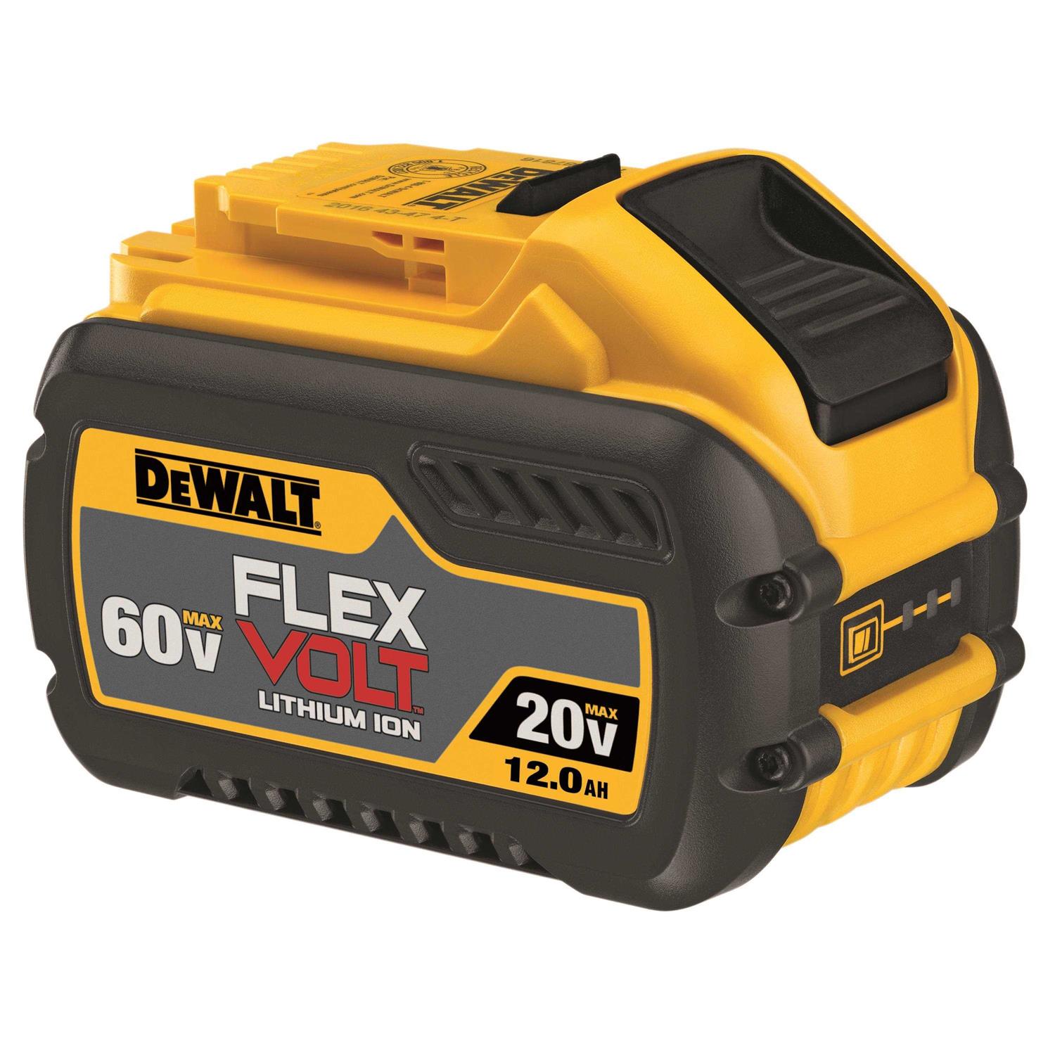 The Flexvolt 12.0 Ah Battery provides up to 8X runtime in 20V MAX and delivers ultimate power in 60V MAX and 120V MAX cordless tools. It changes voltage when you go from 20V MAX to 60V MAX tools. Lithium Ion technology delivers performance in the same size as our 9.0 Ah Battery, so it is more powerful in as compact a package as possible. It also includes a built-in LED Fuel Gauge for instant charge status, and is compatible with all 20V MAX tools and chargers. 12.0 Ah capacity for maximum runtime. Compatible with all 20V MAX Chargers. 3-Led Fuel Gauge charge indicator. Operates in outside temperatures down to 0 degrees Fahrenheit.