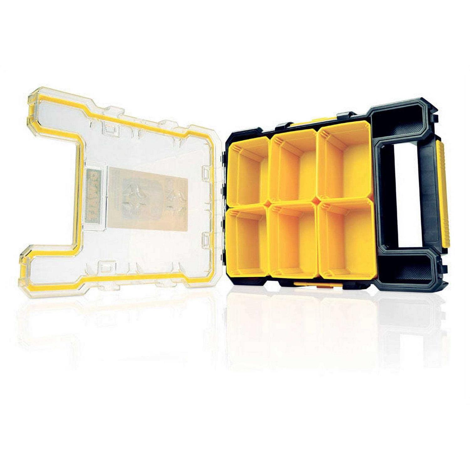 DescriptionMid-Size Pro Organizer with Metal LatchesThe mid-size deep pro organizer is ideal for jobs that require keeping track of small parts. The case has been engineered for durability with a heavy-duty body and sturdy metal latches. The compartments are also removable, making it easier to use on the jobsite.