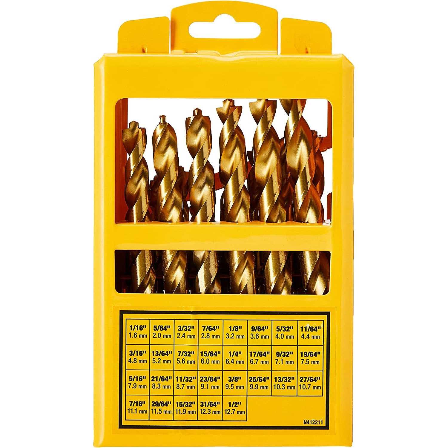 DeWalt’s titanium drill bits have a titanium coating that provides longer life when drilling in non-ferrous metals. These bits are also suitable for drilling in wood and plastic and are ideal for commercial and residential applications. Includes sizes from 1/6 to 1/2-Inch in a tough case.