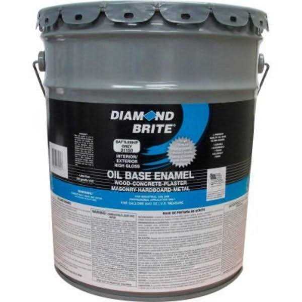 Diamond Brite Paint Oil Enamel, Battleship Gray 5 Gallon Pail 1/Case – 31150-5 Provides a professional quality, high hide, mildew resistant alkyd finish with excellent stain removal. It is a durable gloss enamel that helps protect interior and exterior surfaces against repeated abrasion, rust and a variety of household chemicals. This product is an excellent product to also use in industrial applications, machinery, or commercial uses. It dries extremely hard, and will stand up against surfaces that receive high traffic and use. Properly prepare Interior or Exterior surfaces such as: wood, drywall, plaster, masonry, metal, well-bonded wallpaper, brick, stucco, aluminum and cinder block. 6-8 Hr dry time; 24 hr. recoat time. 300 Sq. Ft coverage per gallon. Mineral spirits clean-up. Protect from freezing.