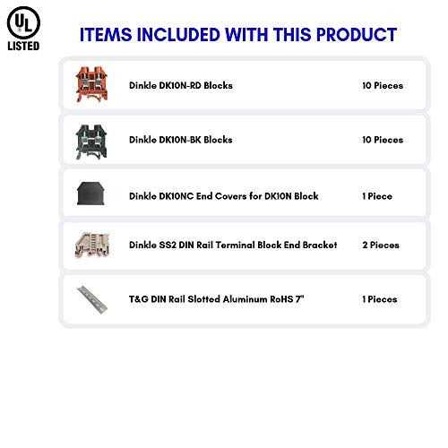 Prebuilt Assembly Red/Black Color UL 600V Rating UL 6-20 AWG Rating UL 60A Rating Separate circuits Technical Data (UL) Rated Voltage: 600V Rate Current: 60A Conductor Cross-section, Solid (AWG): 20-6 Conductor Cross-section, Flexible (AWG): 20-6 Rated Impulse Withstand Voltage: 8KV Torque (N-m): 1.3 Screw: M4 Wire Strip Length: 12-14mm Insulating Material: PA TxHxW (mm): 10 x 49.3 x 42.9 (Individual Blocks) DIN Rail (mm): 35, 32 Jumper/Bridge: Press-fit/Insertion. This assembly includes 5 DK10N-RD Dinkle terminal blocks, 5 DK10N-BK Dinkle terminal blocks, 2 SS2 end brackets, and 1 DK10NC-BK end cover, all mounted on a 7″ piece of aluminum RoHS rail. The 10 blocks are all separate circuits. Accepts TM49W marking tags.