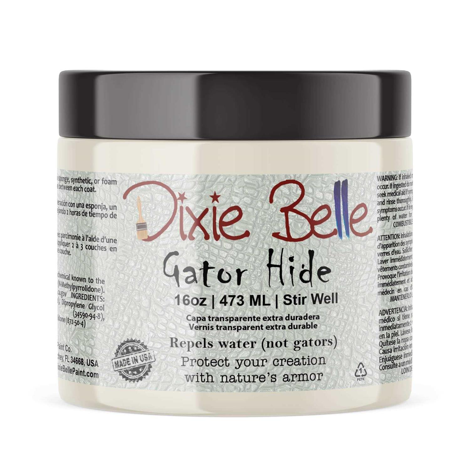 Our Toughest Top Coat, just like the name implies, it is as tough as a Gator’s Hide. Gator Hide is NON-yellowing and has a superior toughness that is perfect for your high traffic areas. Add Gator Hide to your chalk painted kitchen or bathroom cabinets for long lasting durability. Gator Hide is Water Repellant and our rock hard finish will leave your projects beautiful for ages. To use Gator Hide: Allow your finished piece to completely dry. Simply use our Blue Sponge to add a VERY thin layer of Gator Hide. Let it dry and after 2 hours, re-apply. Use Dixie Belle Sanding Sponge to gently sand between coats Let it dry 2 hours and repeat this up to 3 VERY thin layers to get a water repellent finish!